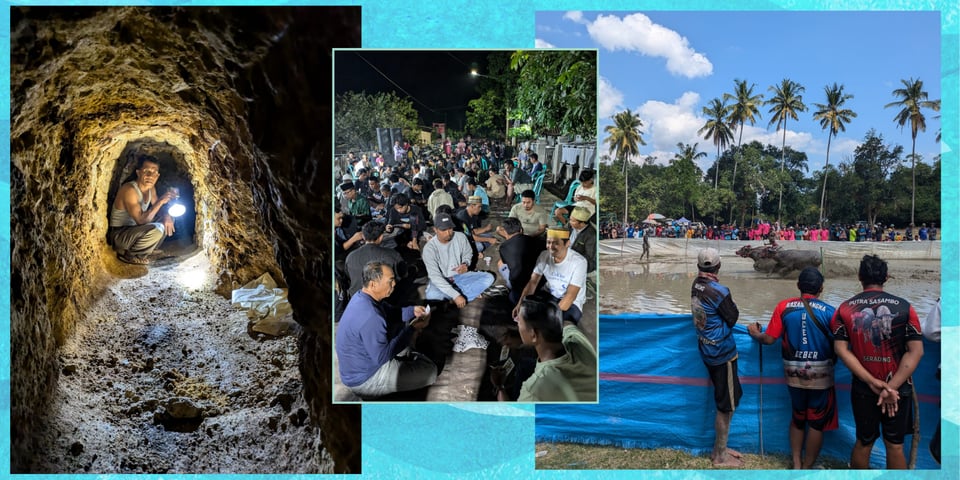 But one of the special things about being here now is that the locals — while baffled by foreign preferences — are actually excited to have us here. They’re as curious about us as we are about them. People are friendly, eager to practice their limited English and patient with our equally limited Bahasa, and delighted to find us patronizing their shop or the fried chicken stand in the village (we’re there a lot, honestly.) We were invited to a “dance culture ceremony” that turned out to be a sunat, a Muslim celebration of a boy’s circumcision. There was a massive card game tournament, free food, and karaoke! Another day, we joined our current host Jitse on a tour of a local unregulated gold mine, where the miner in charge led us down deep, jackhammered tunnels and explained their air compressor system using nothing but enthusiasm and hand gestures. And when we went to the local water buffalo races (footage of the actual day we attended here) it was announced via loudspeaker that the tourists had been invited to give it a go! We declined, but it’s nice to be included.