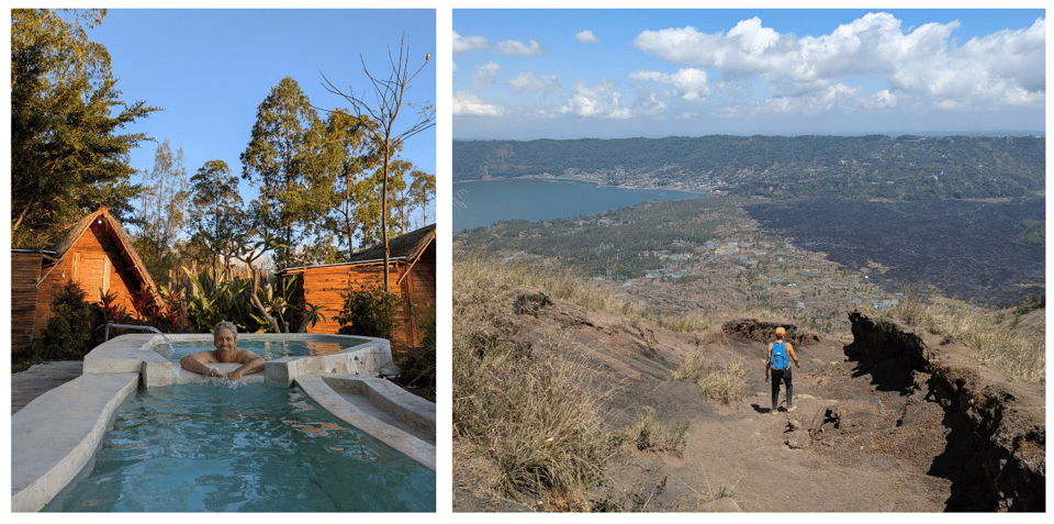 We traveled to Mount Batur by motorbike. We drove along the winding roads that rolled through lush jungle-covered hills, passed countless monkeys waiting for someone to toss out some edible garbage, and stopped to see waterfalls that were conveniently on the way. We eventually made our way to the town of Kintamani, located at the base of Gunung Batur. Dory (the CHO) booked us into a lovely place called Triangle Homestay, equipped with tiny A-frame bungalows and private volcano-fueled hot springs. Fun fact: volcanic hot springs don’t smell like sulfur! We assume this is because they’re being heated directly by the volcano itself… but don’t quote me on that.