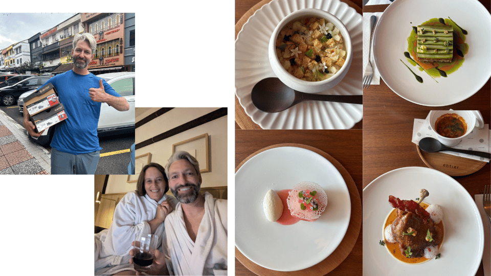 Back when we were on a visa run in Kuala Lumpur in early July, Dory, who is officially our Chief Housing Officer (CHO), booked us into a very fancy hotel called the Alila, which we paid for using just 5,000 credit card points a night. In that hotel, one floor down from our room, there was a Michelin selected restaurant called Entier. Upon investigation, they offered a 5 course set lunch for just $25 each, so we decided to reserve a table. The only catch was that they had a dress code that required closed-toed shoes, and all we had brought to KL were our Bedrock sandals (which we’ll celebrate in a future newsletter.) Since we had been talking about trying to hike some volcanoes at some point, we then had 2 reasons to buy shoes. So in preparation for our lunch reservation the next day, we went out shopping for some fancy lunch shoes that could also serve as volcano hiking shoes. We found some inexpensive trail runners at the mall, which performed marvelously at the restaurant, and would hopefully do just as well at bagging a few volcano peaks.