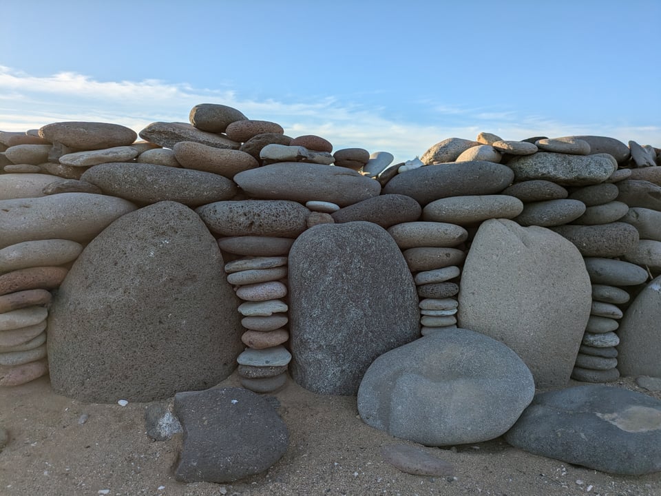 Folks that come to The Wall often stay for weeks or months at a time, just waiting for the right conditions to line up to deliver perfect waves. We know the waves must sometimes be truly excellent to make up for the fact that it’s sort of a miserable place to be for a long time. But we also know the waves must often be terrible, because there are a lot of very fancy rock walls around, and you only build those when the waves are bad and you need to kill time until they get better. To be honest, I was quite impressed with some of the rock structures and would be excited to take on a project of my own if we ever come back with a nice camper and a month with nothing to do.