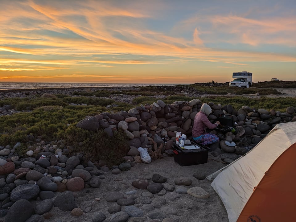 During our short time at The Wall, the waves were small but with a good shape, which made for some enjoyable surfing. Dory began to find her stride on the longboard that we’d picked up in Cerritos. We could imagine staying there for a while, but without a robust shelter, we were starting to feel a little worse for wear. On the third evening, just as Dory began to heat up some dinner, we ran out of fuel for the camp stove. Recognizing that as a sign, we sadly ate our cold quesadillas and prepared to spend one final night in Tent World.