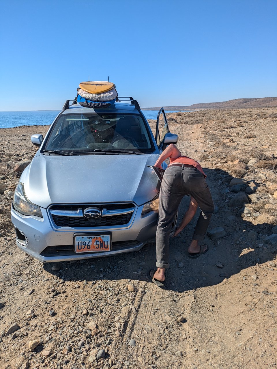 After a few hours of white-knuckled concentration, several scrapes and bonks to the undercarriage of the vehicle, and a temporary detachment of the front bumper, we arrived just a stone's throw away from our destination, Santa Rosalillita. Tragically, the final stretch required us to cross a sandy beach where we were guaranteed to get stuck.