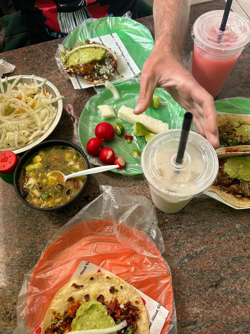 When we weren’t surfing or cooking on the hotel porch, we were visiting Taqueria El Perico, where we were blessed with the most delicious tacos de suadero and vampiros de adobada, topped with a tomatillo salsa studded with chunks of mango, avocado, roasted garlic, and spicy dried chiles. This is where we learned that “adobada” is just another word for “al pastor”, meaning delicious marinated pork fired on a spit. Complemented with a fresh guava juice or horchata and a slice of chocoflan for dessert, these may have been our absolute favorite meals in all of Mexico, and one of the greatest of all of Big Trip. We went back five times.