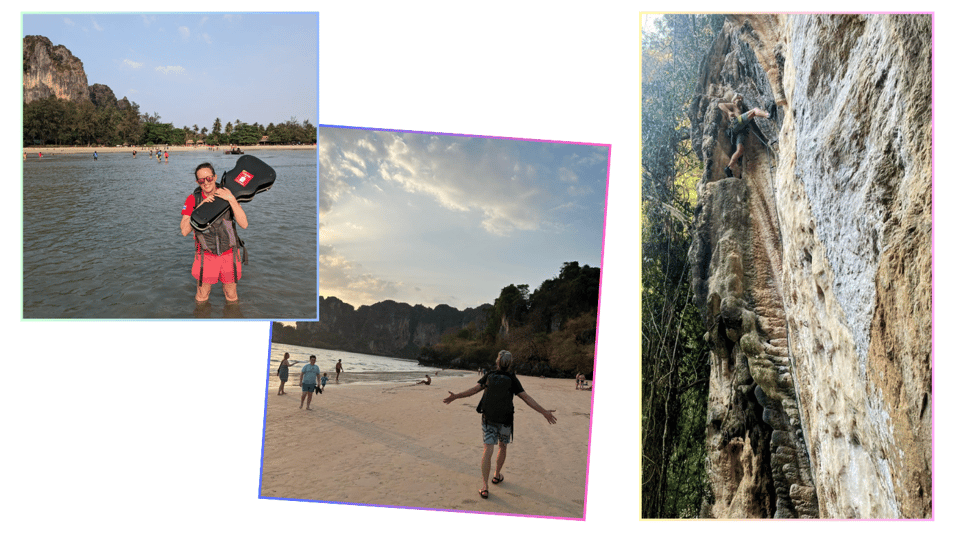 After exploring a little bit of the island on our last day in Koh Lanta, we acquired more tourist destination stickers at the Lanta boat terminal and headed to Railay Beach. Most people who visit Railay are drawn in by the pristine beaches surrounded by impressive limestone towers rising up out of the sea. The other great thing about limestone rock formations is that they are ideal for rock climbing. For decades, rock climbing routes have been bolted around Railay and a couple neighboring beaches, making it arguably the best place in the world to rock climb at the beach. I am the type of person who, when presented with two good options, will usually opt for both, if possible (think cookies AND ice cream; or for our SLC crew - Utah Dream Day - skiing, mountain biking AND rock climbing in one day). So for me, being able to climb world class routes AND swim around at a postcard-worthy beach all in the same day was a dream come true.