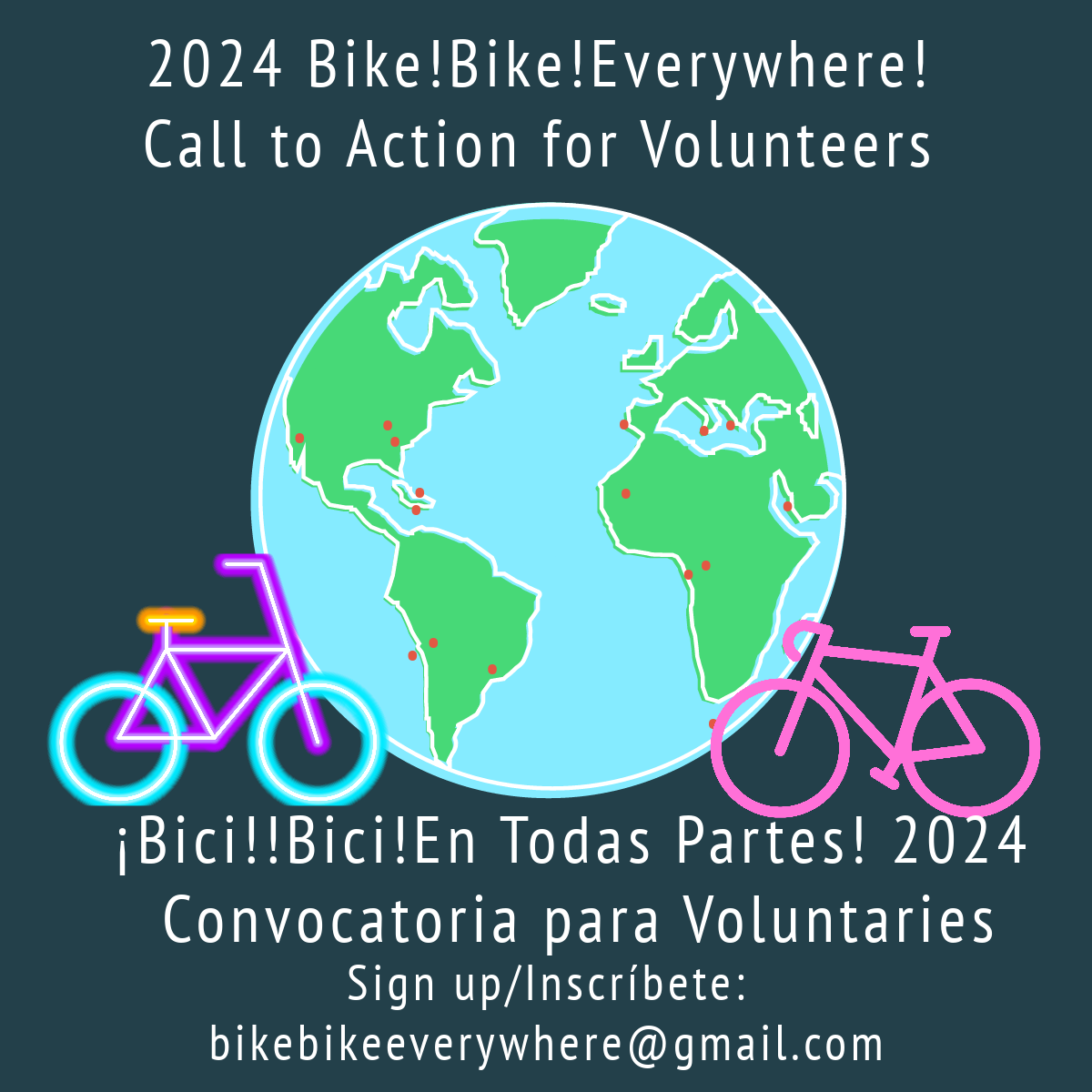 Envíenos un correo electrónico a bikebikeeverywhere@gmail.com si deseas formar parte del equipo de voluntaries del comité coordinador o de una comisión al que te gustaría unirte. Para formar parte del comité coordinador, ayuda saber algo de inglés, poder participar en una llamada de grupo semanal/bimensual y dedicar al menos 3 horas de trabajo a la semana durante los dos meses previos al evento.
