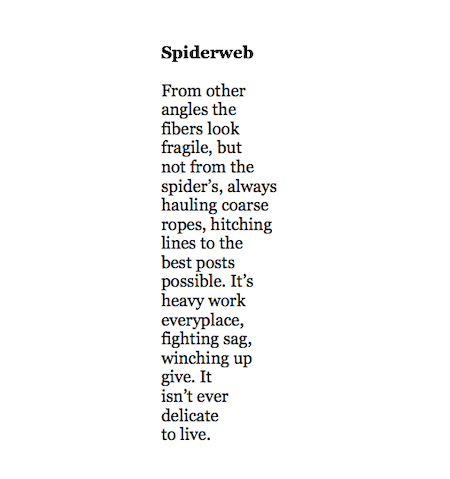 For me the only way forward is to think of what helps my inner arachnid build and rebuild, of what keeps the ropes strong, of what posts I can hang onto, of what inspires me to keep spinning the threads despite it all. There is, of course, labor involved, but this is the work that makes the heavy work lighter to bear.