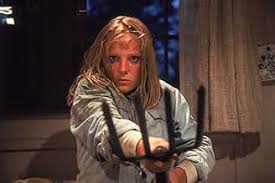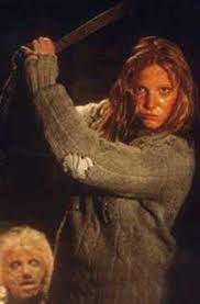 But underneath all of the fear he brings, Jason Voorhees is a deeply tragic figure. He is doomed to wander the grounds of Camp Crystal Lake for eternity, killing anyone who disturbs his otherwise quiet existence. He is a little boy who died, and was brought back to horrible life by his mother’s desperate grief. And no one but his final girls are willing to acknowledge that. This tragedy is spotlighted in one of the final scenes of Part 2 in which the final girl, Ginny, finds the shack Jason lives in with his mother’s head sweater set up on a kind of altar deep in the woods. She pulls the sweater on, and speaks as ‘mother’ to try and talk Jason down before she kills him. This strategy is ultimately unsuccessful, as she breaks character too soon, and is attacked again, but it draws the audience’s attention to the fact that Jason is still a child. He just wants peace. He just wants his mother. But she’s gone, and now there are loud, clueless teenagers, much like the ones who let him die in the first place, intruding on his sanctuary. And what does he know other than the violence his mother taught him?