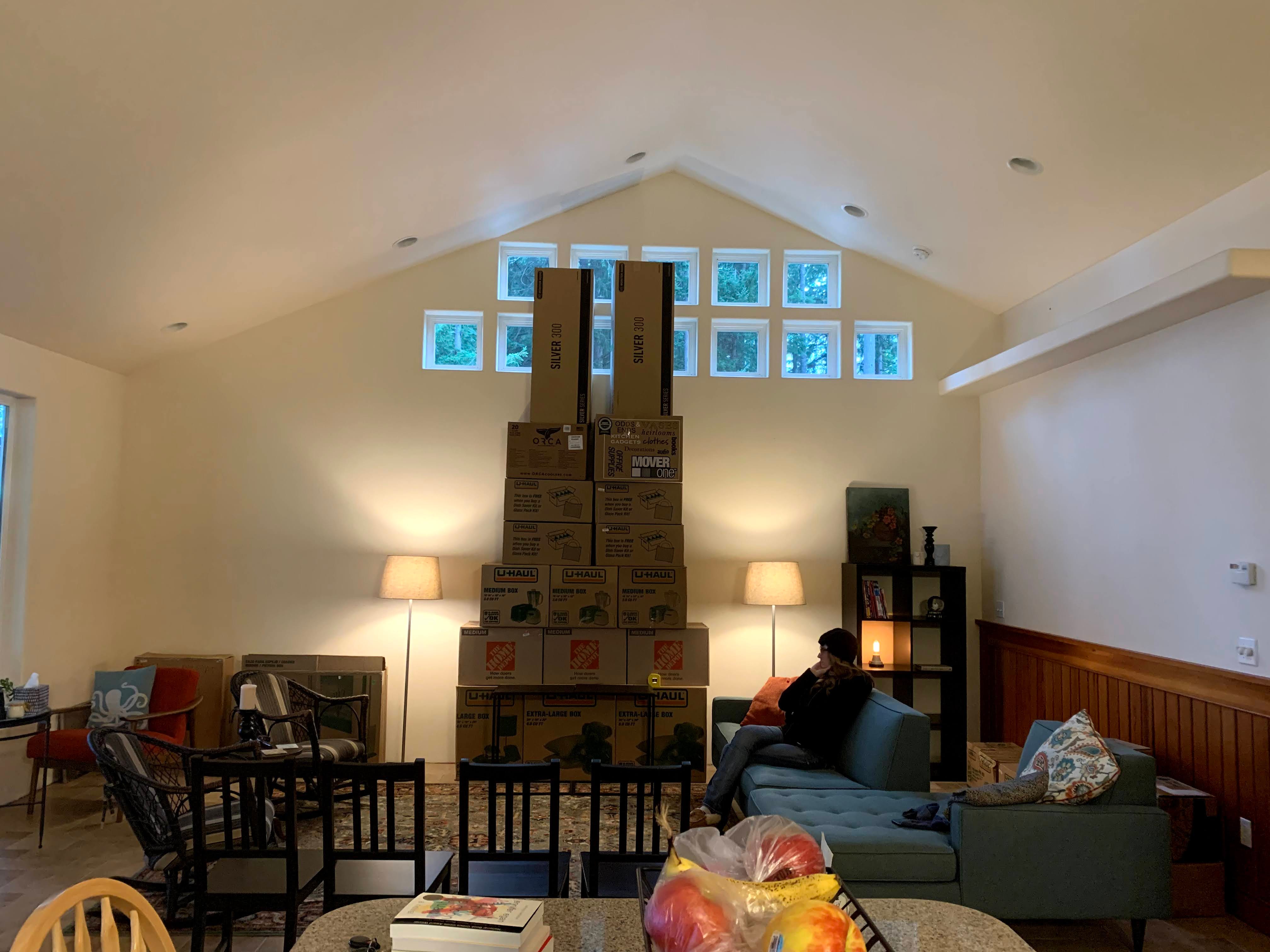 Unpacking! My husband Ross and I moved into our new home. We love it and we’re excited about making a couple changes. One thing is that we want to add a fireplace (a façade with a gas insert) and to visualize it, we built one out of boxes. It will go all the way up to the ceiling—we just didn’t have a ladder taller than four feet—and the windows will likely be closed up so that it’s all wall (still deciding on that one). What do you think?