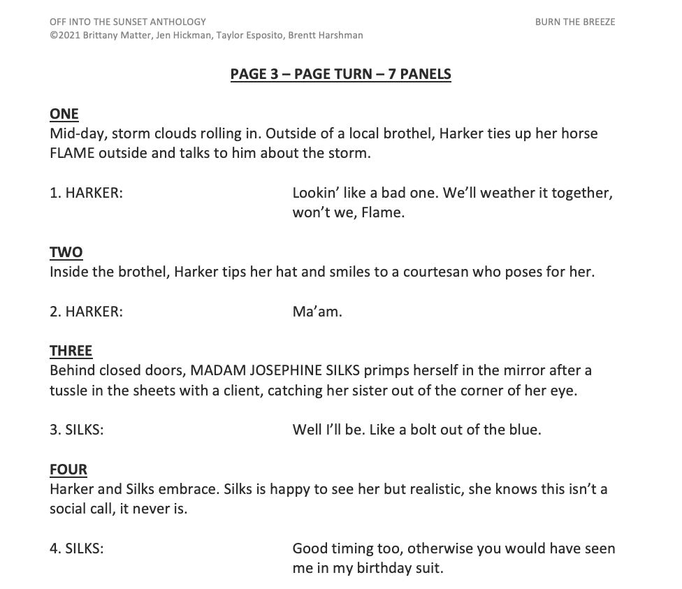 Here’s an example from my short Burn the Breeze, which reflects most of the tips above (side note: this comic will be in Brentt Harshman’s Western anthology OFF INTO THE SUNSET. Hit the “Follow along!” button here to stay updated):
