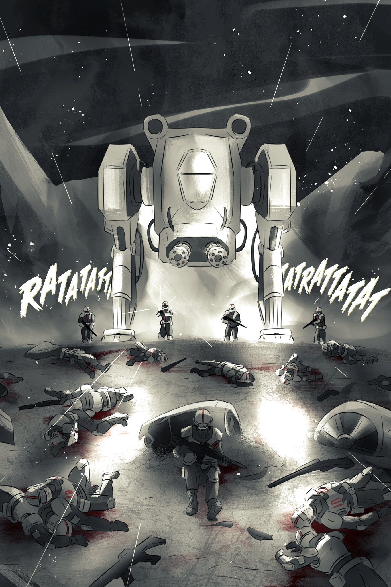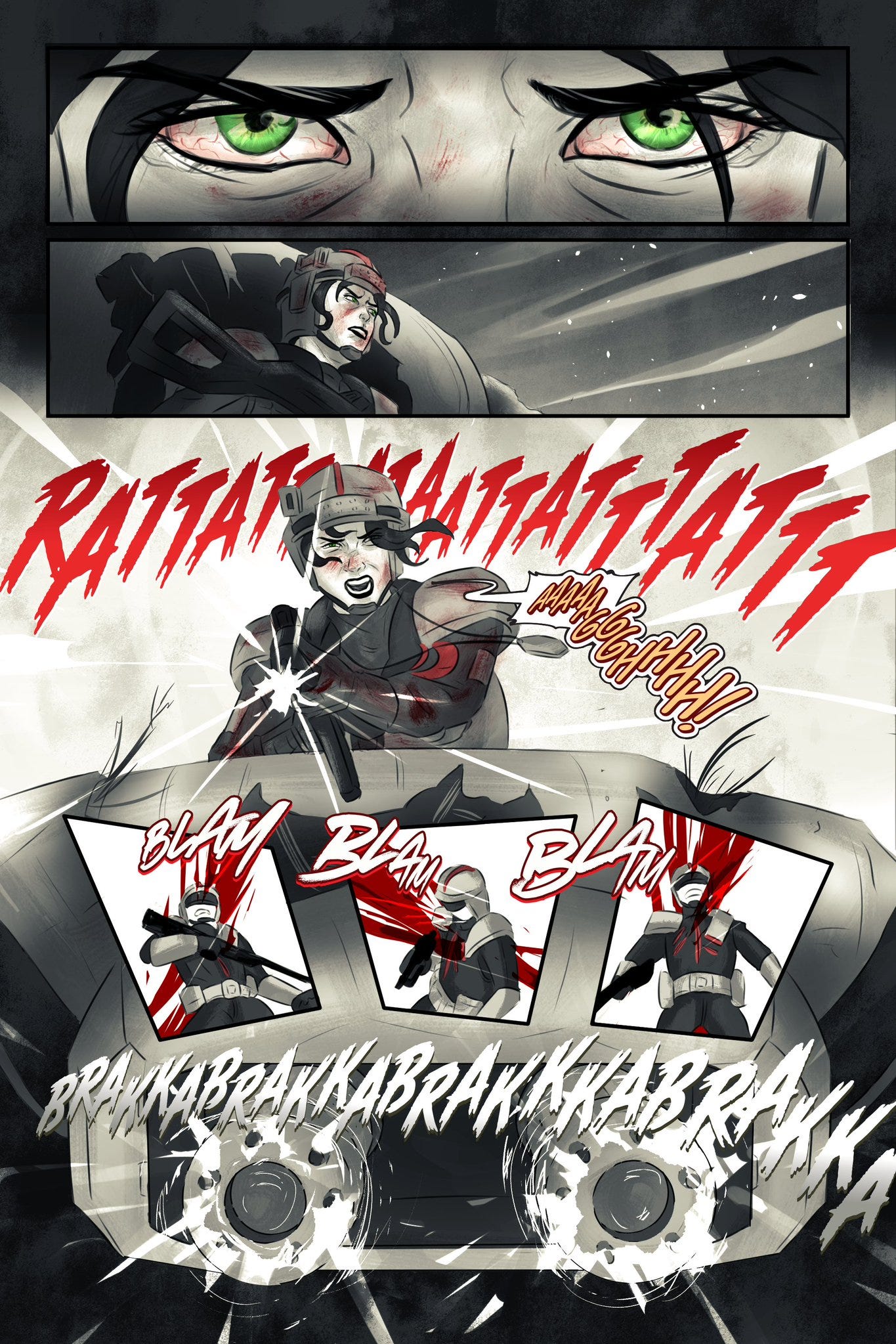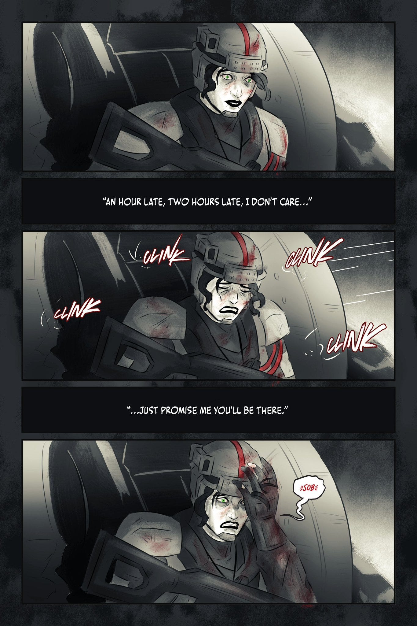 FH: I think most of the reason my stories end up becoming military fiction is because it’s kind of the easiest excuse to draw what I love to draw? I love to design armor pieces and big weapons. I love to draw mechs. I love drawing fighter-type women. So the genre itself is really just a copout so I can draw all the things I love.