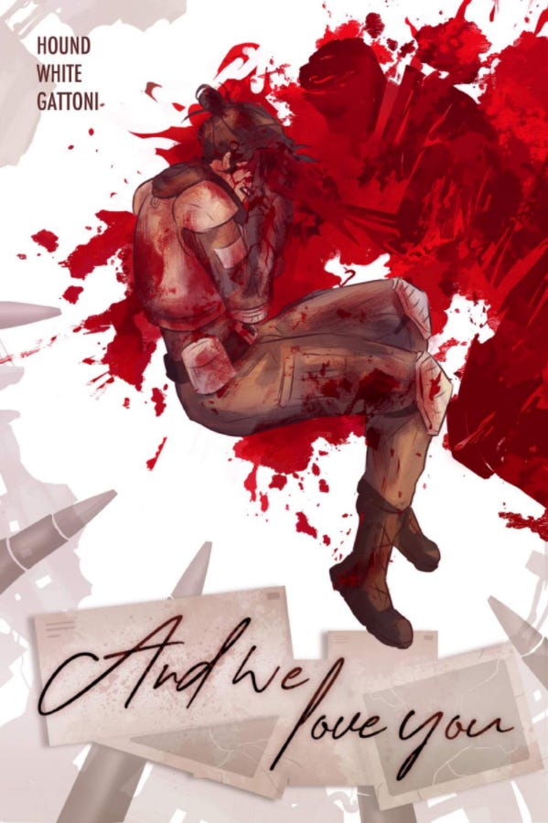 Fell Hound: And We Love You is a 64-page graphic novella set in a dystopian war-torn future, and tells the tale of a young soldier (Julie) who perishes on the battlefield and bleeds out all her memories. It’s part war drama, part queer love story, and part coming of age tragedy—all told through the bloody, technicolor lens of having your life fade away from you. It is also a prequel to my last comic, Commander Rao, and we get to explore what a younger Rao was like at the war’s infancy and her relationship with Julie.