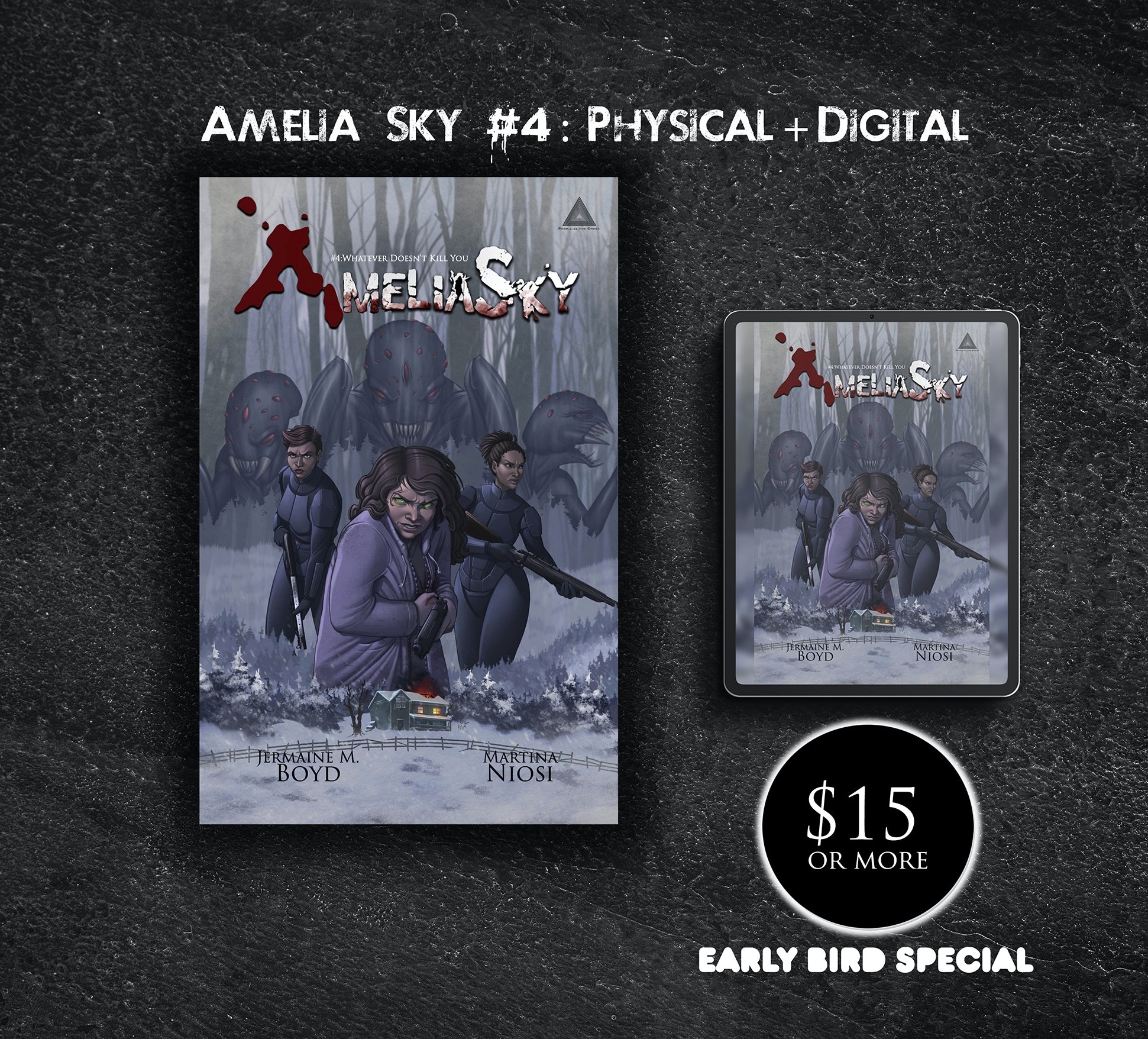 AMELIA SKY #1-4 follows an amnesiac girl with the power to save the world from a deadly alien invasion. It’s got all the post-apocalyptic thrills and chills that’ll give you goosebumps and a burgeoning sci-fi mystery that’ll keep you wanting more. Writer Jermaine M. Boyd and Artist Martina Niosi join me to chat about the latest issue subtitled “Whatever Doesn’t Kill You,” what kinds of things challenged them as creators, and why they chose Kickstarter as their crowdfunding platform.