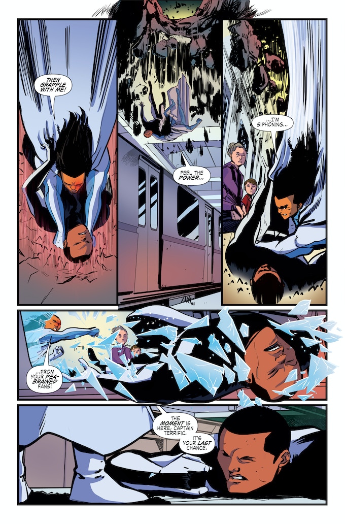 JI: Citizen Tyranny in this issue is so thorny that now he controls Mattie's super best friend channel. Tyranny is going to gain new powers as he absorbs all the power of Mattie's fans and Captain Terrific fans, and is going to become a new monstrous threat to them both.