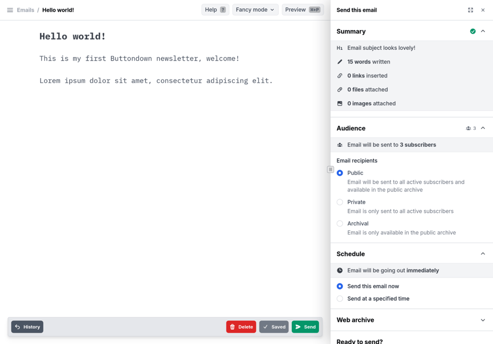Tell your friends and family! Buttondown’s interactive no-signup-required demo site just went live. It has all the functionality of the platform, and none of the marketing headlines. You can’t send emails, but you can do almost everything else to get the feel for sending newsletters before jumping in and starting your own list.