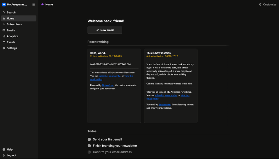 We’ve given Buttondown a few new coats of paint CSS this month. First up, the new home screen. It’s a quick recap of your newsletter: What's new, what's important, and what needs your attention. You can write a new email, pick up where you last left off, and finish any remaining account setup tasks, if needed.