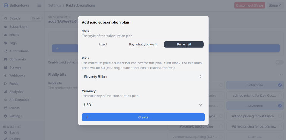 Some platforms force you to offer fixed-schedule subscriptions to your fans. Not Buttondown (anymore!). Go to your Paid Subscriptions settings, click Add plan, and choose the Per email style to charge subscribers every time you send them something you lovingly crafted.