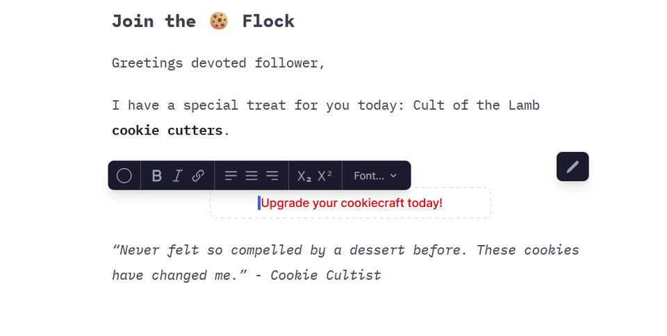 You can now write whatever you want inside the buttons in your newsletter. Invite subscribers to pre-order your book, sign up for your app, join your Patreon, anything (legal)!