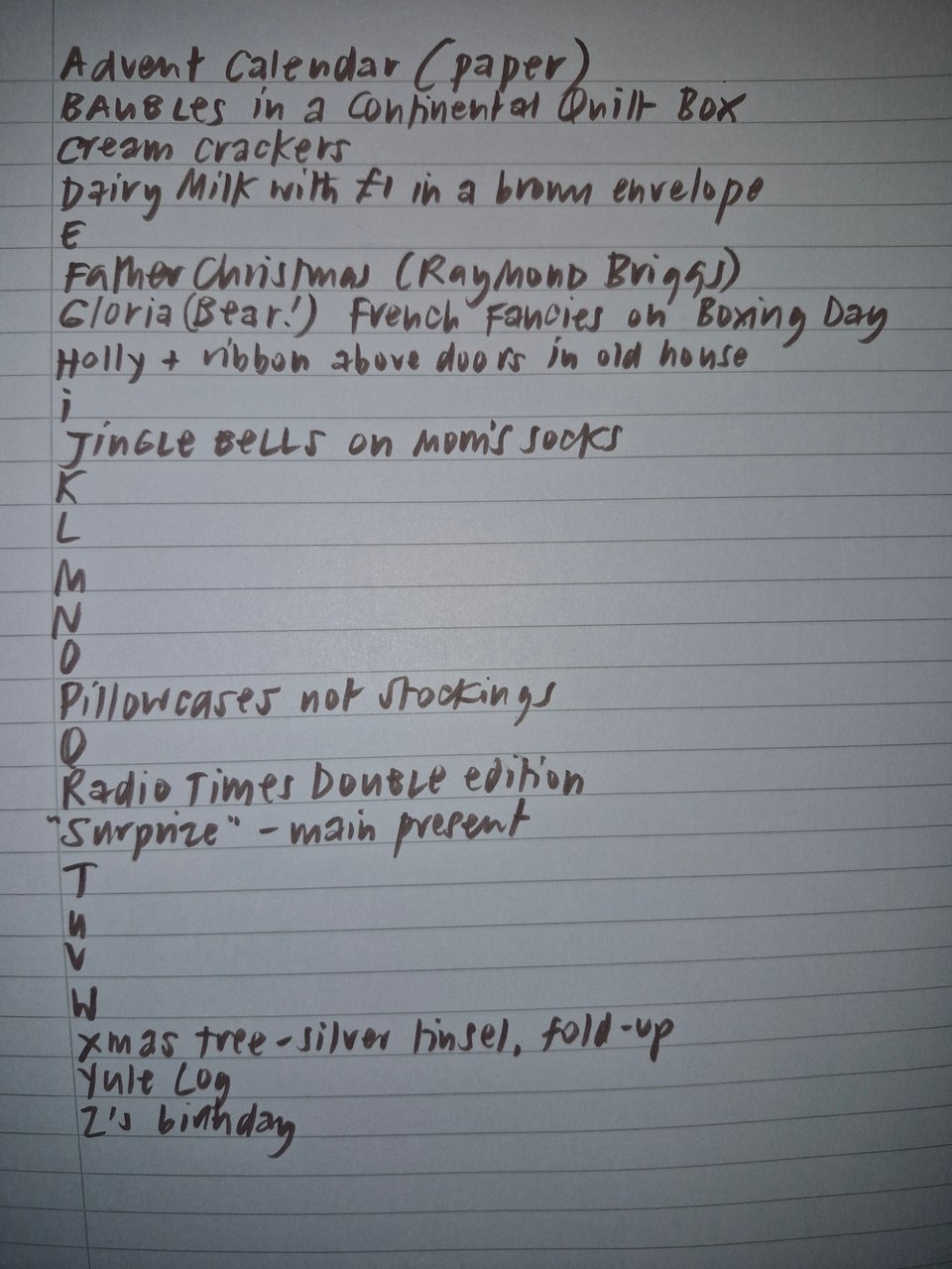 Set a timer for 5 minutes. Write the letters of the alphabet down your page and then add in words that you associate with the season. As with most writing endeavours, I find concrete objects rather than emotions or ideas more generative. You don’t have to move through the alphabet consecutively, and the words don’t have to make sense to anyone else. Pick a word and set your timer for a further 10 minutes. Write down everything you associate with that object or memory as notes or full sentences. See where it takes you in the time.