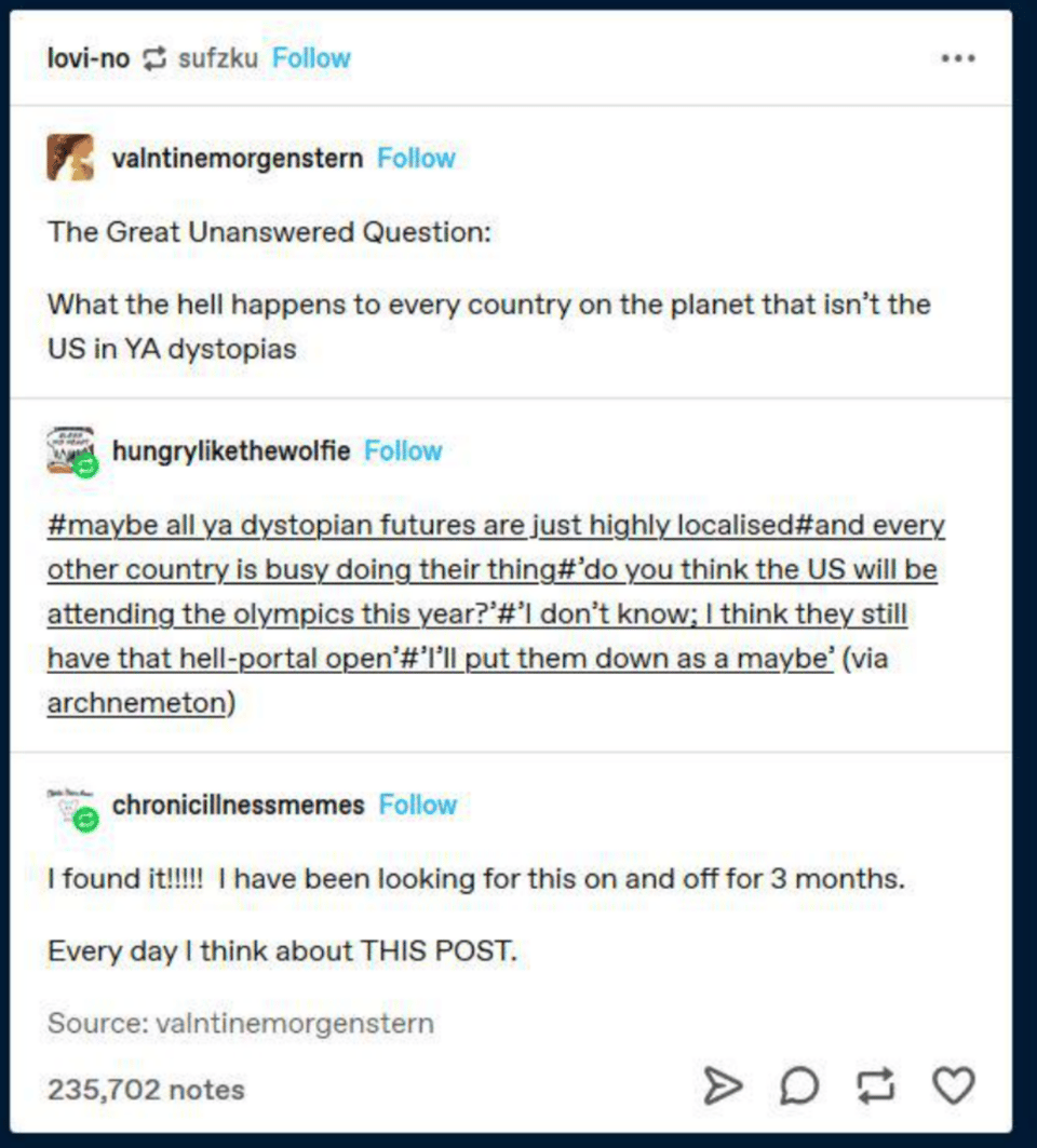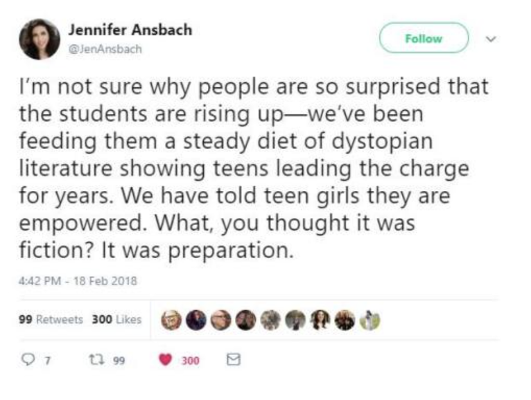 There’s a teacher that keeps coming up on my feed who reads the Hunger Games books to her students, and has them work through the underlying lessons and themes of the series. Her students are vocal and angry and intelligent and quick with putting things together when she hits every conceit and moment of character development. It makes me wonder what’ll happen ten years from now, and what will be used to help explain it.
