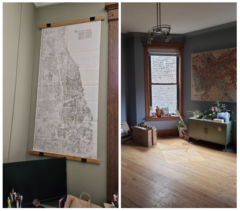 Barring the military-industrial-complex of it all, I think it’s actually an interior decorating dream to have floor to ceiling maps. I have a little taster of that in my office-dining room combo, thanks to Tim Wallace — when I was in New York for onboarding last year for the fellowship, he slipped me a copy of the Times’ gorgeous interactive and print runs of Microsoft’s building footprint data for Chicago.