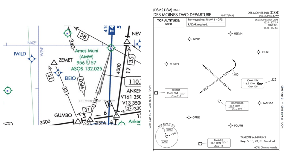On the waypoint front: Des Moines regional airport, for example, has genuinely tickled me pink with theirs, including KORRN, HEEVN (no, it’s Iowa), ICUBS (go minor league!), MANAA (another heaven reference?). Ames municipal airport has the great EIEIO, which just makes me laugh, too.