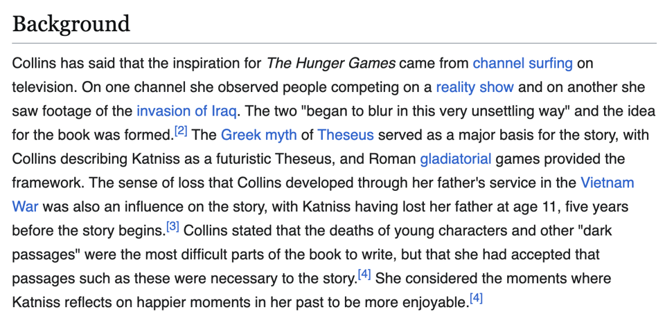 I recently reread about the development of the Hunger Games franchise, and rewatched all the movies: I’ve seen this pop up here and there in viral Instagram and TikTok posts, but Suzanne Collins channeled a combination of her father’s PTSD from serving in Vietnam with her own anxieties and disillusionment with the invasion of Iraq. There’s a lot of staying power with that.