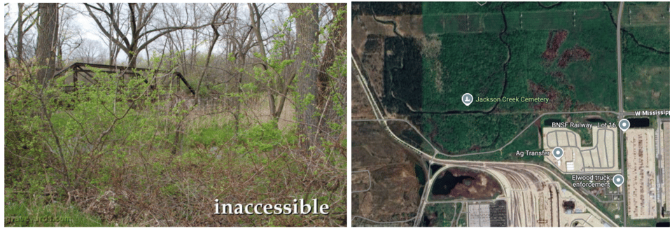 Jackson Creek cemetery, not that far away, which is just listed as “inaccessible,” (could you imagine?) per lauded Illinois history researcher + writer Matt Hucke (whose book, Graveyards of Chicago alongside Ursula Bielski, is very good!) and his blog, which is a treasure trove for local history and decaying places.