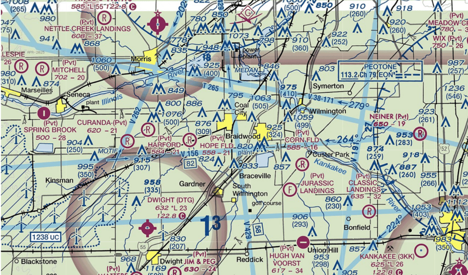These maps are so wildly information dense, including when it comes to military operations. The hashing and marking on the maps is quite distinct to separate restricted airspace from other types of airspace, and it’s sometimes easy, sometimes hard to find more information about each MOA, or military operations area, and the types of things they’ll be undertaking within that area that might make it unsafe or restricted for civilians. Typically, especially out in the Midwest, they’re doing night flying or interception training at some of the air national guard or (downstate) the Air Force.