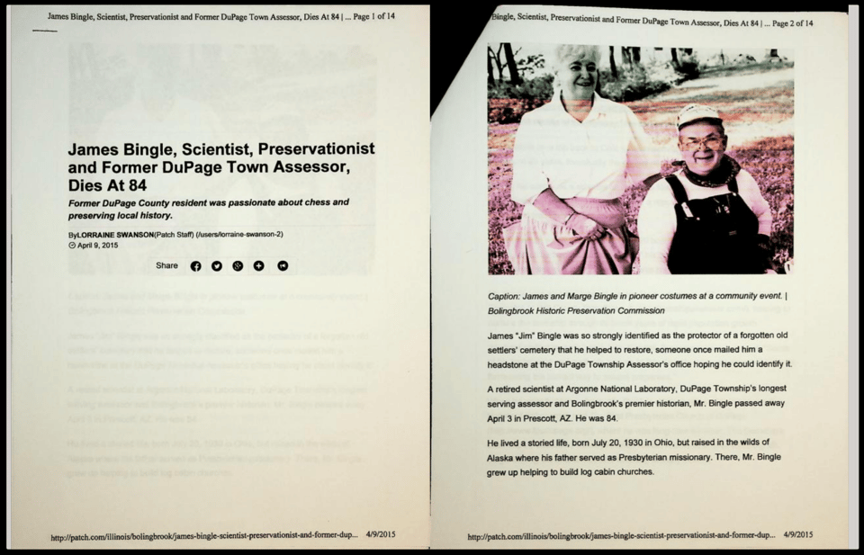 Bingle died in 2015 and had an insanely fascinating upbringing. Born in Ohio, raised in Alaska (in the 1940s!) and then moving to DuPage Township, he was a township assessor and the founder of the local historical society. It’s arguably mostly because of him that Boardman still exists.
