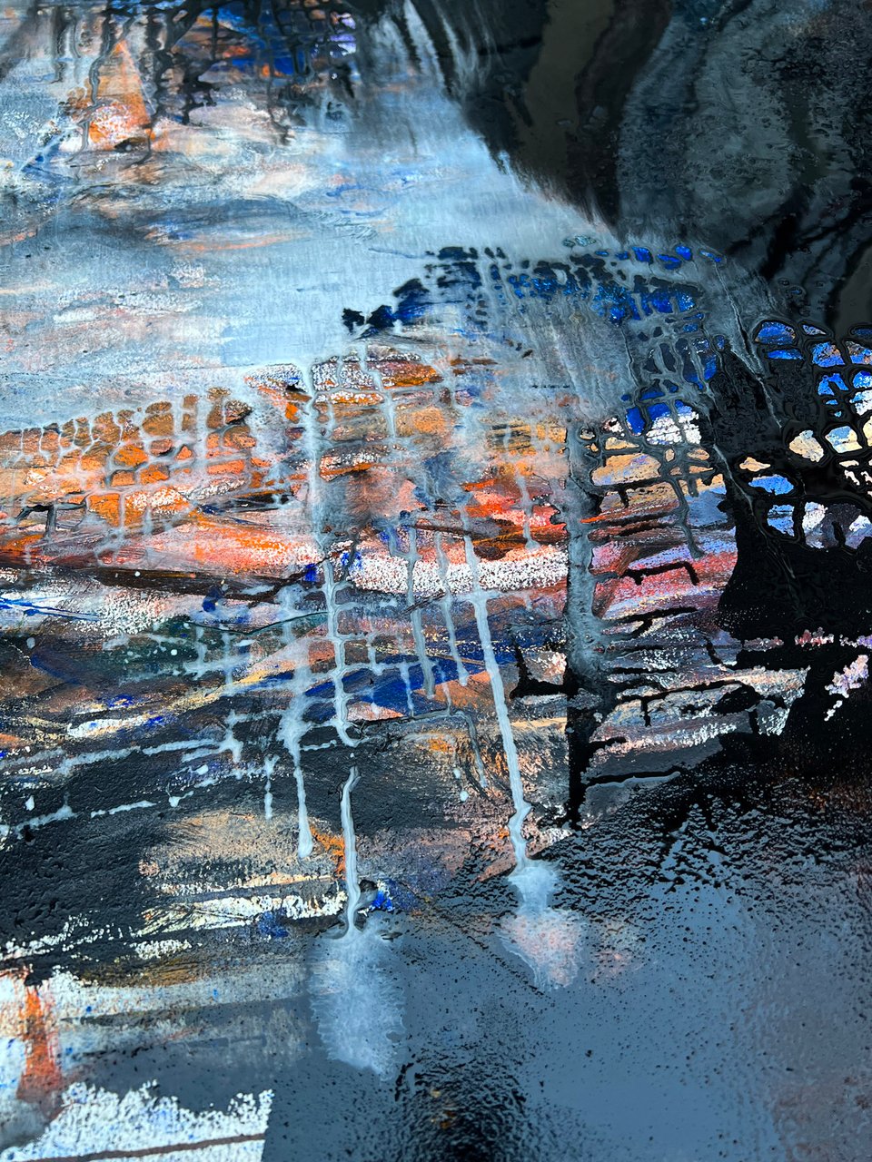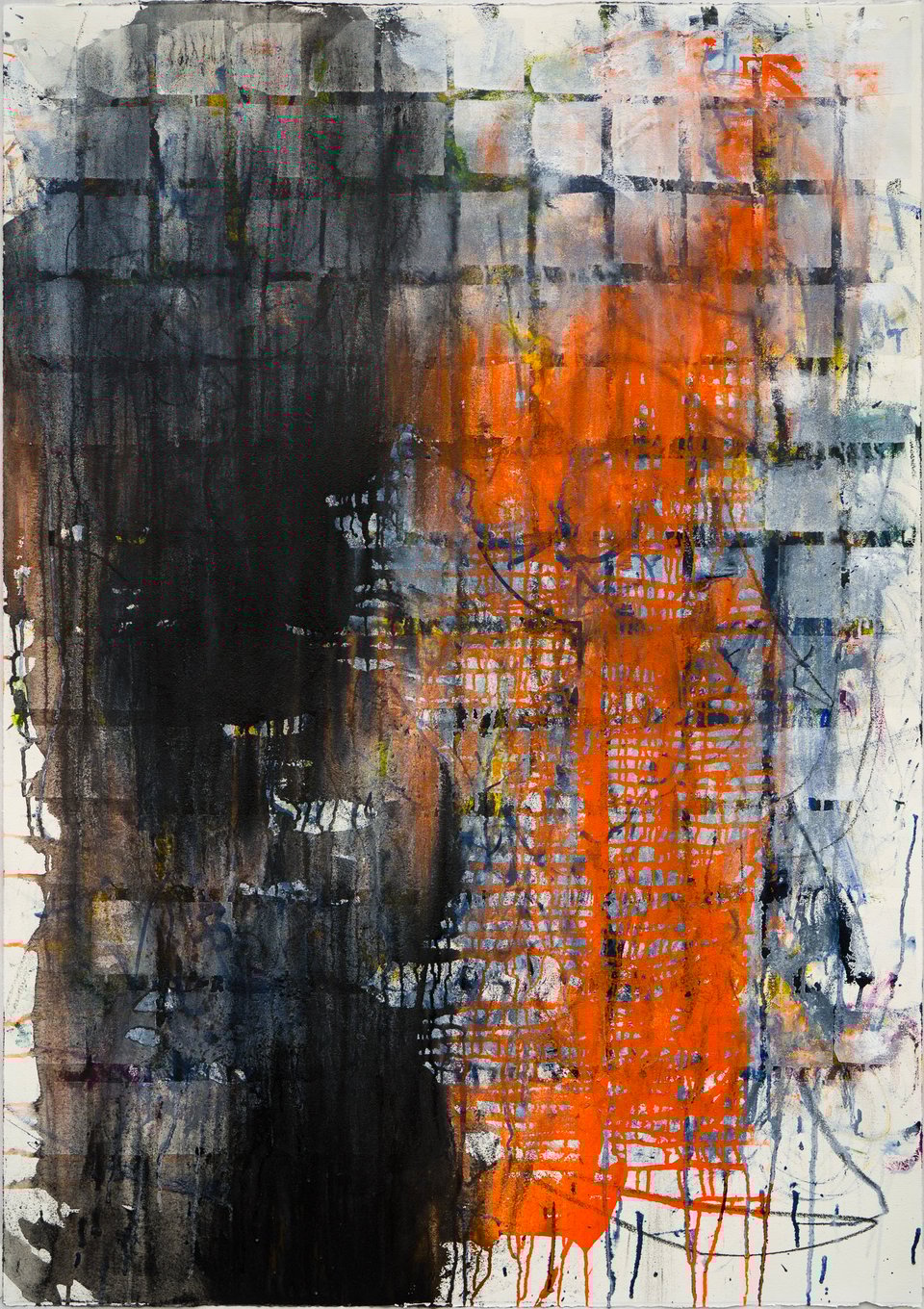 I’m fascinated by the reappearance of the Cartesian grids in some of these works. Yet here, instead of constraining and organizing, they find themselves subsumed, overwhelmed, as liquid force bursts through, or as if the smoke of the Pyrocene were billowing out. (I needed a respirator to paint these works in Minnesota this summer, with Canadian wildfires burning 2000 km away.) Have we already entered the Age of Fire?