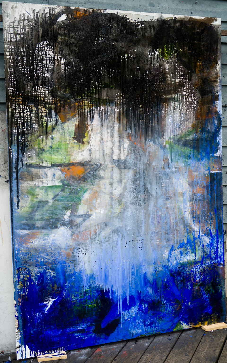 I began this summer wondering whether the divergence between the large-scale, plein-air abstractions and the more fraught line of thought in the Dispersions and Deluge works might resolve. The answer seems to be that some works begin as one, and finish as the other: as destruction, or as a thoughtful friend suggested in an email, as “a completion or a necessary contrary of the thing destroyed?” I had imagined arriving at a synthesis of modes, but this process is utterly different: a first state that suddenly calls for a mad reversal, an intervention that is frequently fast, brutal and definitive, everything that the process I have cultivated — long, patient building and accumulation (think Cézanne) — is not.