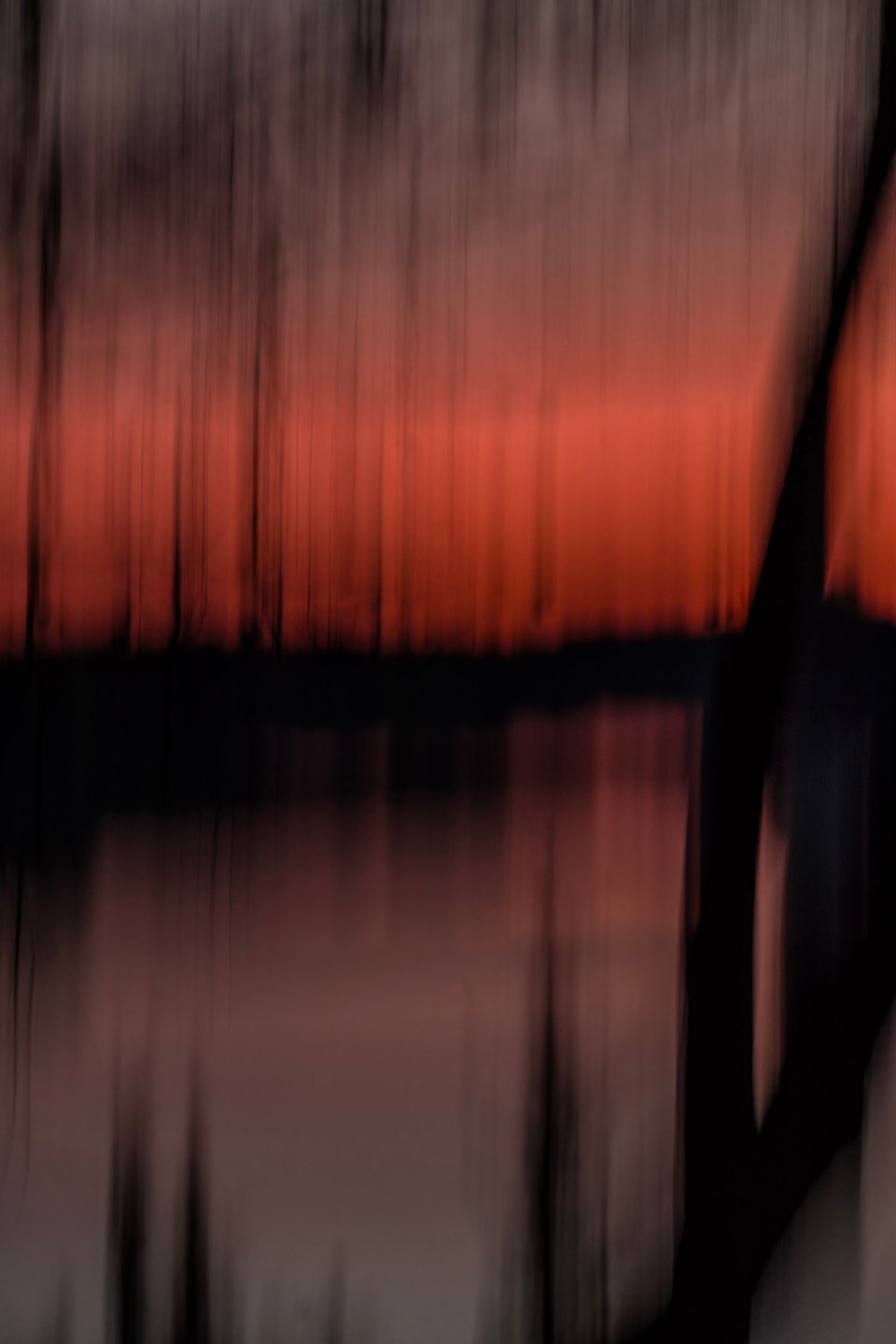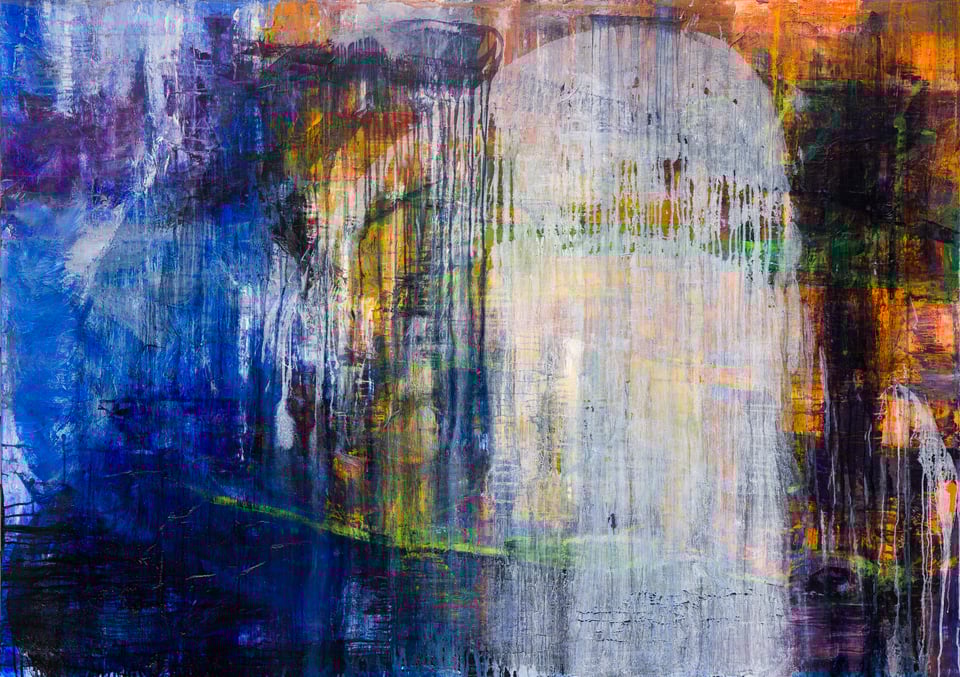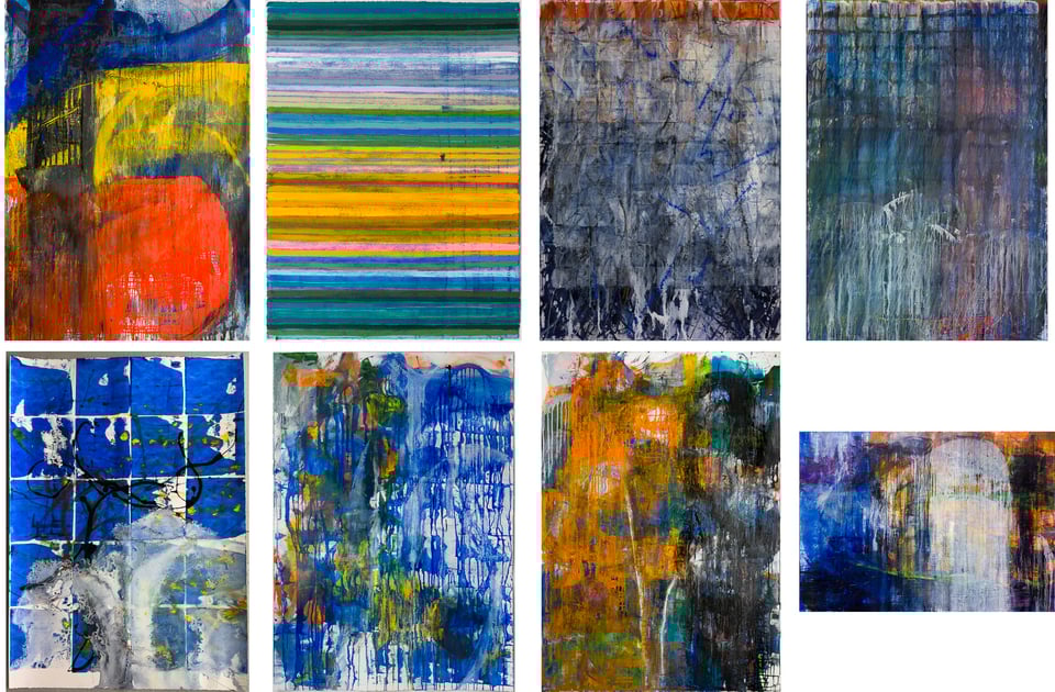 You can see at various points an underlying grid slips in and out of prominence, and I still find it provocative as a representation of something like human organization, or city space; a stand-in for things we make, that which is not nature, something that nature overtakes. The works in the climate-emergency Deluge series appear to stand apart with their floods and paroxysms of pigment, as if those interventions were capricious additions. Yet the separation between the Deluge works and some imagined-to-be-purer landscape mode was quite blurred in practice by the stinging clouds of smoke drifting down from the huge Canadian wildfires, turning the sunsets dark red.