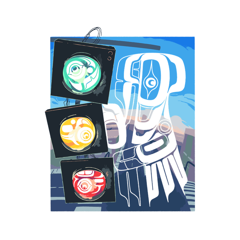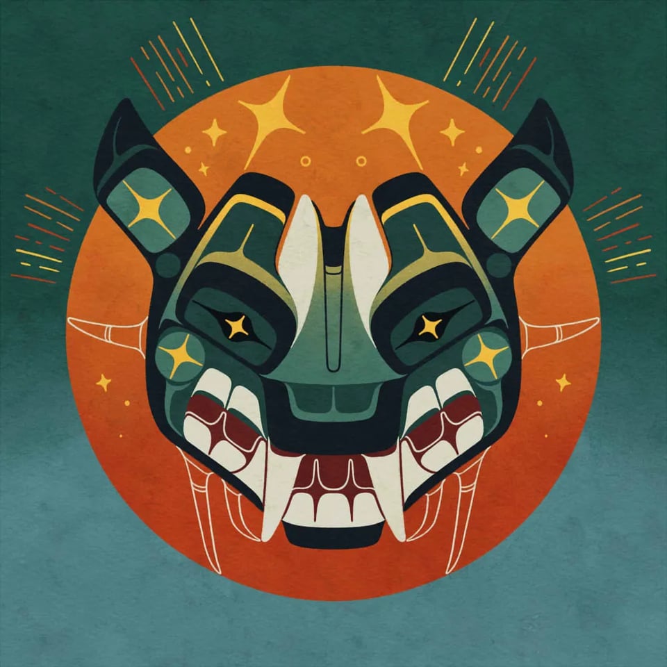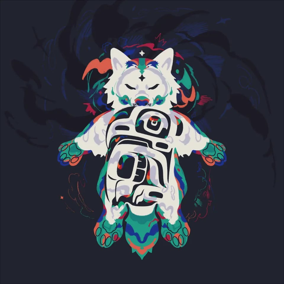 It's called "Wilaayu naat 'nüüyu", or "I know who I am" in Sm'algya̱x. This is a line from a song that's often shared by one of my Sm'algya̱x language teachers. The song itself is about being strong, not letting things get to us or take us down, and knowing where we come from. The wolf is styled to look like my fursona a bit, and the design carved in its abdomen is an eagle - which is also my crest (Laxsgyiik). This started as just an experiment in incorporating more explicit anthro imagery in my stickers which I've been wanting to do more of, and ended up becoming a really nice piece uniting my Tsimshian lineage with how I represent myself as a furry artist.