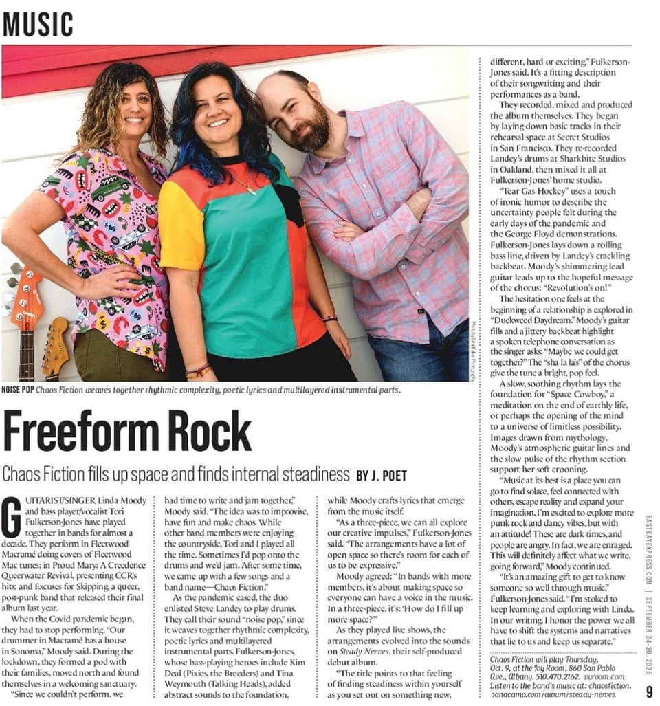 Chaos Fiction is an indie noise pop trio from San Francisco, California. They are celebrating the vinyl release of their debut album “Steady Nerves.” Their music weaves psyche rock, shoegaze and noise rock influences, and showcases their tight pop-influenced melodies, dreamy vocals, noise guitars and driving bass lines.