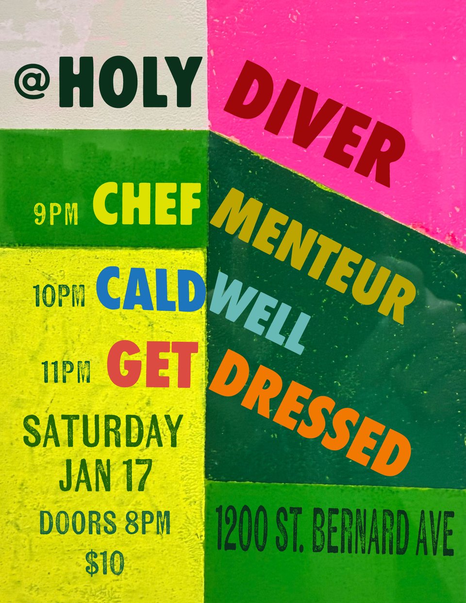 Chef Menteur, now including Court Batson on bass and Philip Cooper on keys along with Alec Vance and Dan Haugh, will be playing FIRST this time, at around 9PM, again at the Holy Diver, one of our favorite places to play our present version of garage-psych-drone (post-)rock. We will be followed by Caldwell, which is the solo project of Kevan Caldwell (formerly of the Planchettes), with a full band presenting some lovely retro-inspired tunes of his own, and Get Dressed who are also from New Orleans, and will appeal to fans of 80s-90s indie punk.