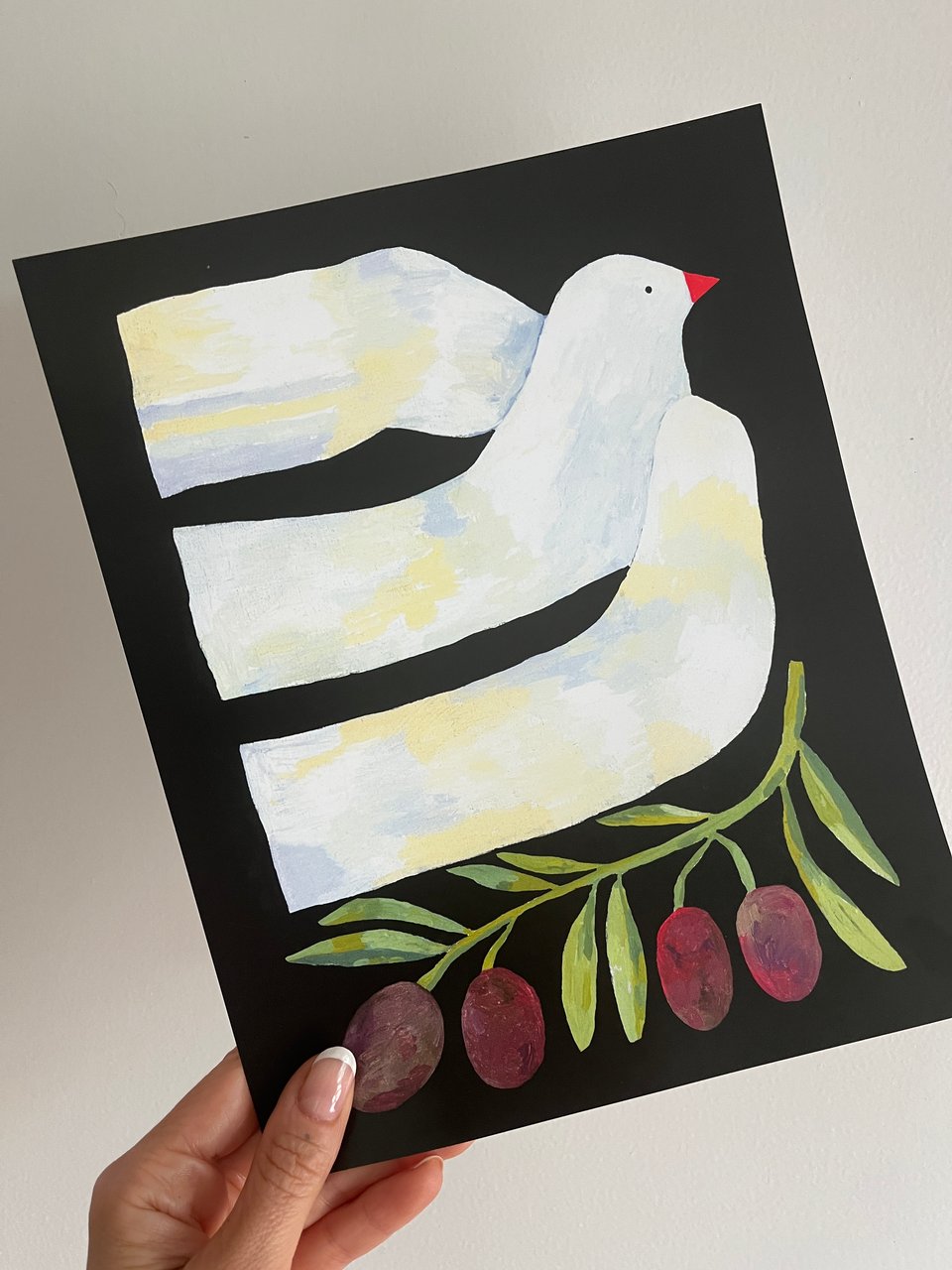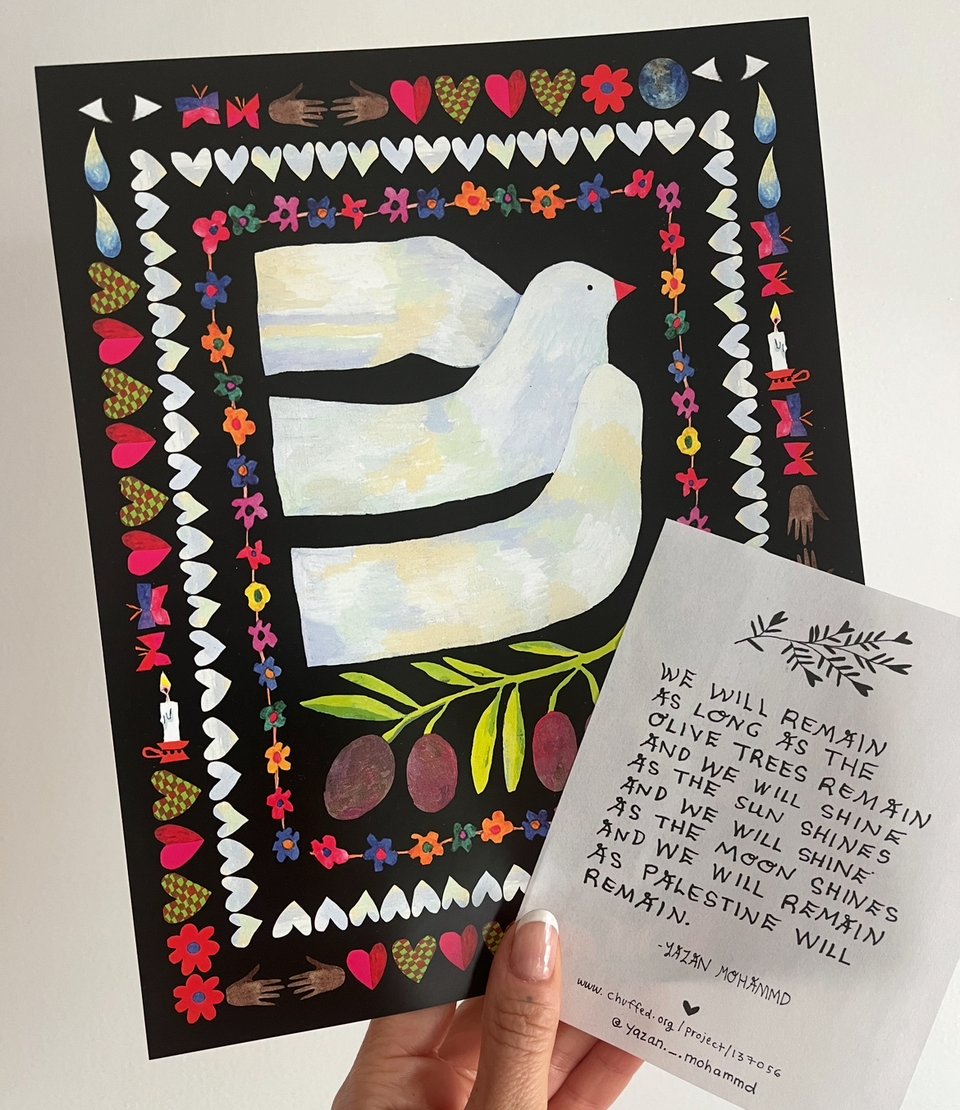I’m selling some really special prints. There are two versions (1) & (2) of a painting I made back in November 2023, at the start of what has now been 700+ days of the genocide in Palestine. For me, painting has always been spiritual. Besides taking action in every way I knew how, this painting was a moment for me to pause in grief and prayer. Recently the painting took on a life of its own when a friend introduced me to Yazan, an amazing eighteen-year-old writer & organizer living in Gaza. I started selling the prints with all proceeds going to Yazan and his family & community. Yazan and I have gotten to know each other and his generous heart inspires me every day. Each print comes with a beautiful piece of his writing.
