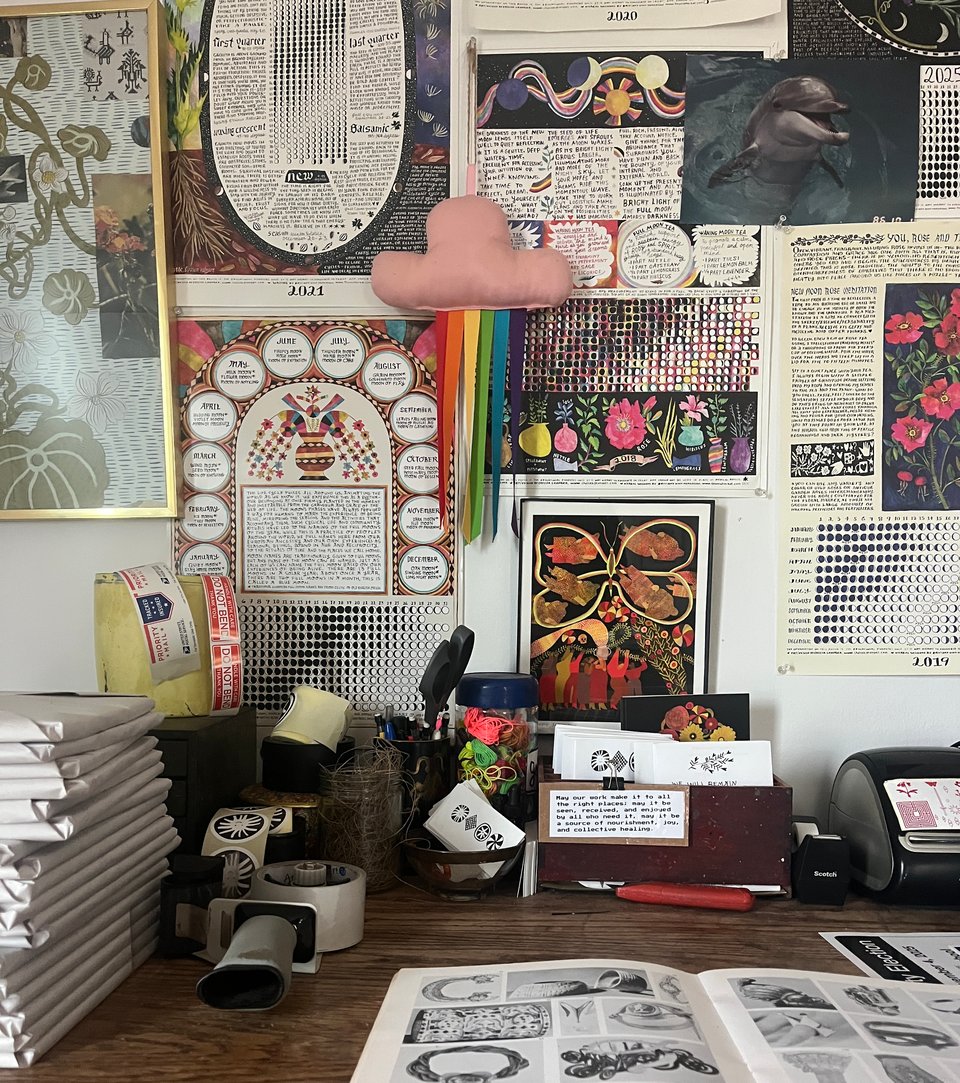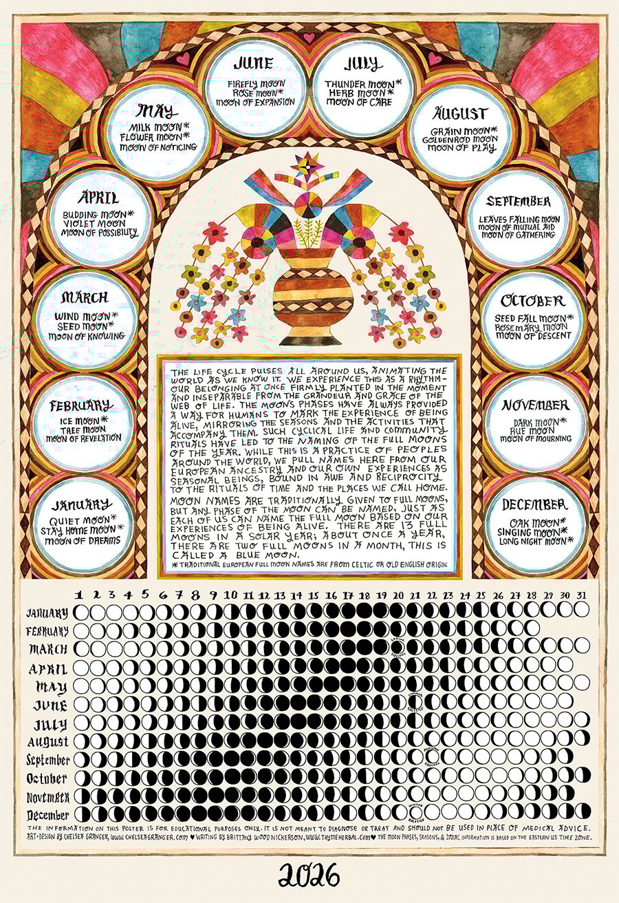 This is the 15 year anniversary of the moon poster project that I make with my dear friend Brittany Nickerson. We met many years ago working in the front of the house at a bar & restaurant in western Massachusetts. We developed a sweet friendship that led to meeting up monthly to support each other through holding space for our individual creative practices. That time together eventually led us to collaborating on a variety of posters. This year’s calendar draws on the ancient and cross-cultural tradition of naming the full moons of the year. For this project, we drew on full moon names from our European ancestry as well as our own experience of the moon through the seasons. Brittany does the writing and research and I do the illustration, design, and hand-lettering. You can buy one here or we have a special deal if you buy two!