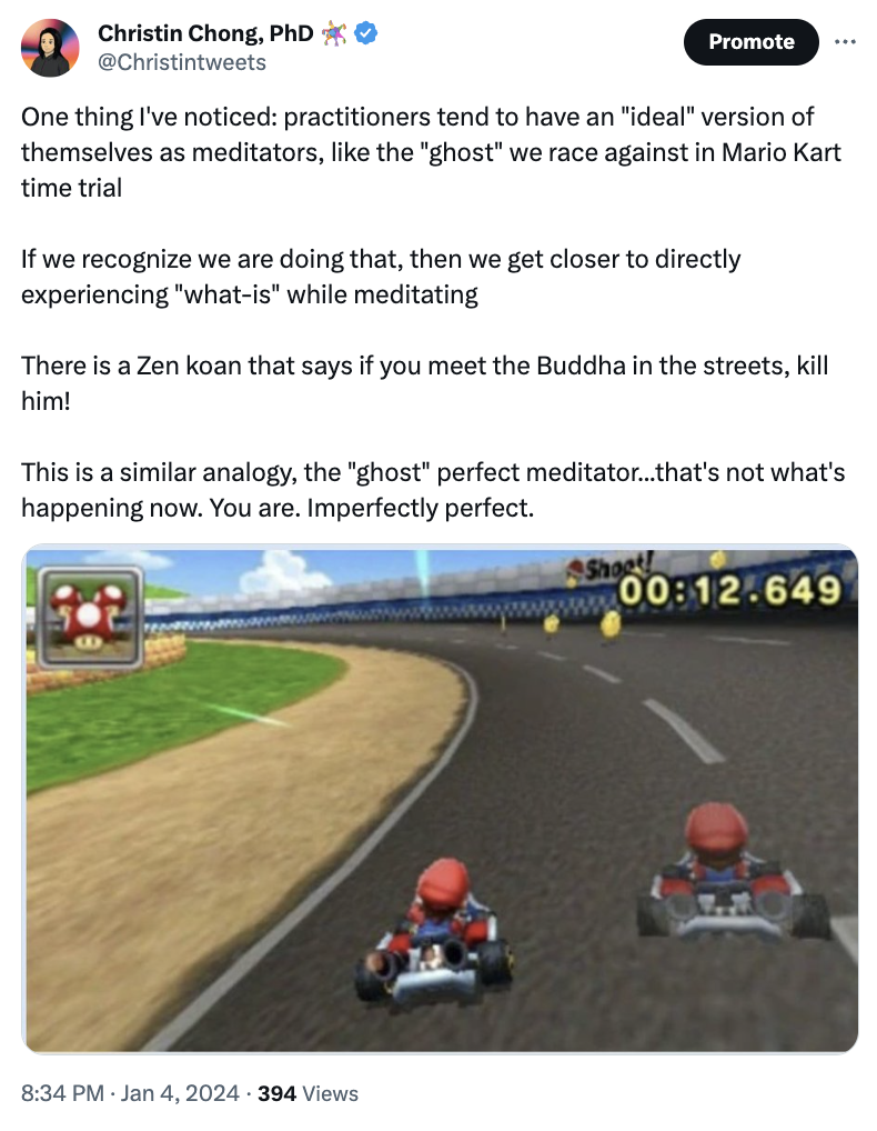 One thing I've noticed: practitioners tend to have an "ideal" version of themselves as meditators, like the "ghost" we race against in Mario Kart time trial