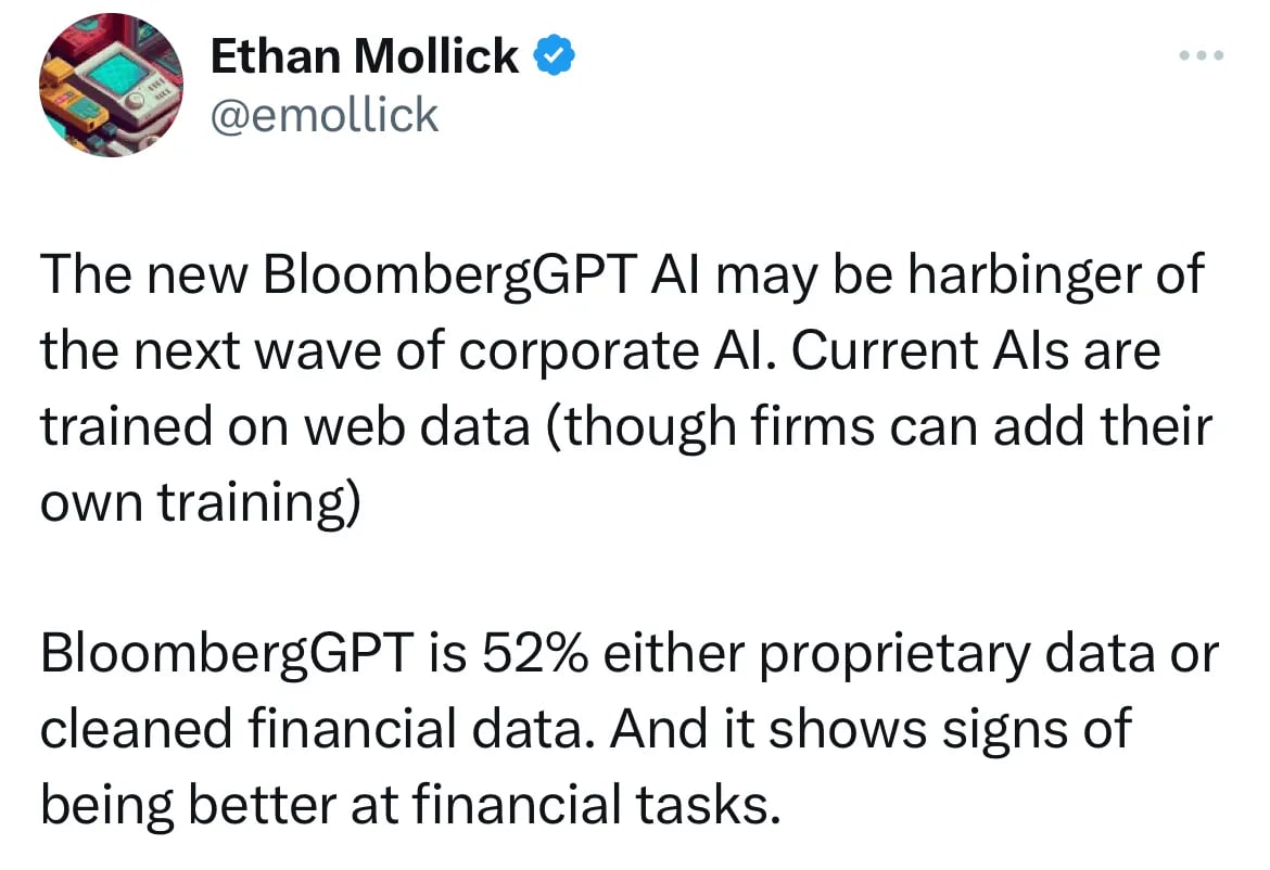 Last week, Bloomberg launched BloombergGPT, which uses the same large language models as ChatGPT, but is trained on proprietary financial data.
