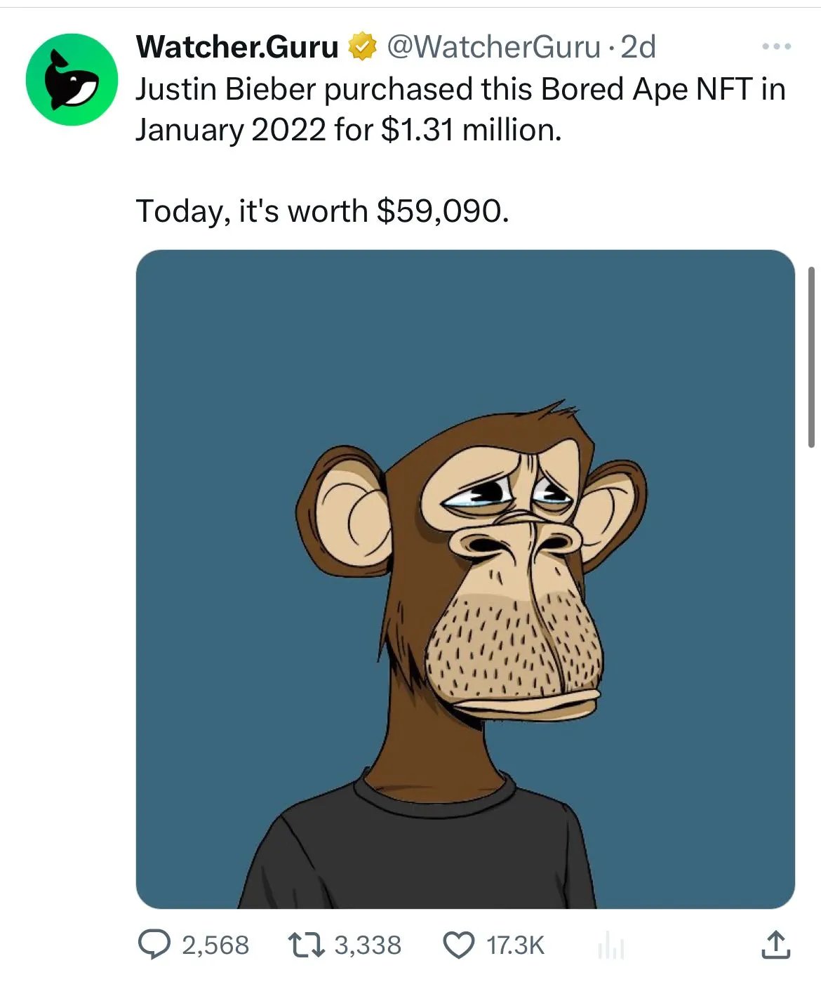 A great reason to be happy this week is if you didn't buy a JPEG of a monkey thinking it was an investment. For example, the one owned by pop star Justin Bieber was purchased for $1.3 million in January 2022 and is now worth $60,000, with possibly no buyer even at that price.