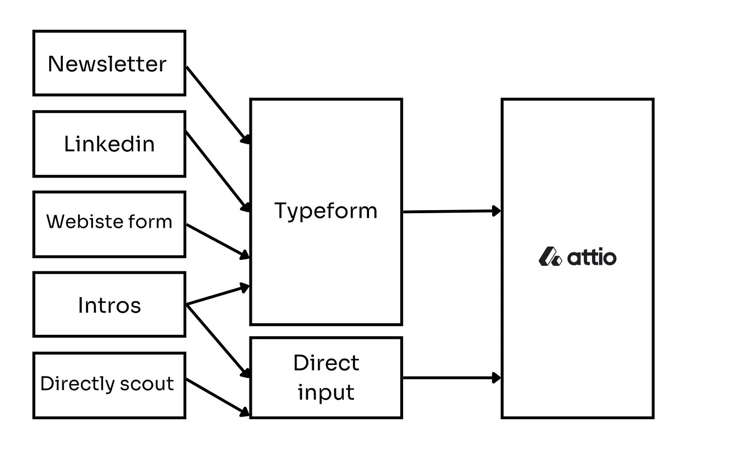 Founders who fill out the form (a Typeform) on my website or newsletter effectively do the data input for me. Typeform and ATTIO are relatively easily integrated.