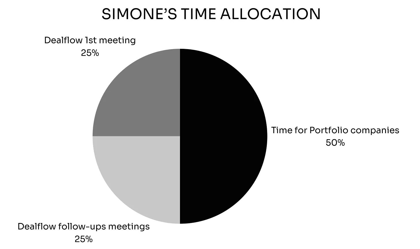 Each year, I meet 100-150 new founders (20-30% of the projects received). I keep up to twelve 45-minute slots open per week in my agenda for meetings. These slots are typically split evenly between meetings related to my portfolio companies and dealflow-related meetings.