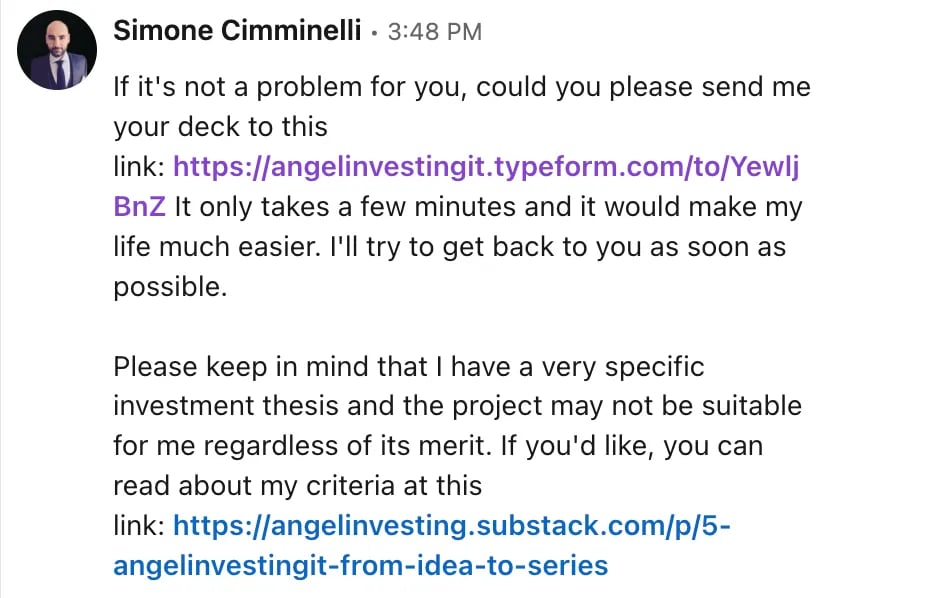 Founders who contact me via cold contacting (typically LinkedIn) receive a message as shown below, inviting them to fill out the Typeform linked with ATTIO.