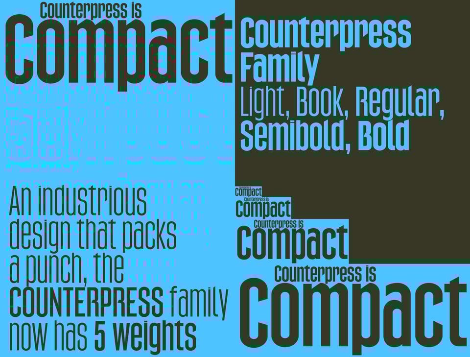 Counterpress has since been expanded to the Extended Latin character set. Now with a array of weights, from Light to Bold, it is perfect for usage in cohesive typographic design systems, from eye-catching signage and packaging, to multi-line headings and longer passages of display text. Check out Counterpress →