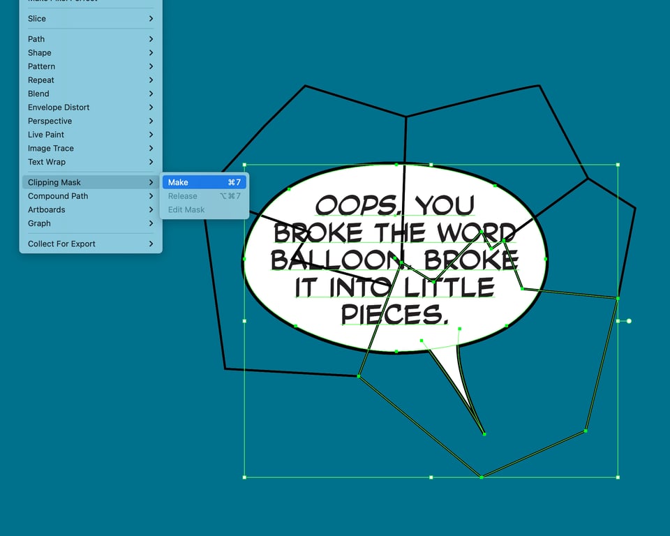 Then, after all of your fragments are drawn, select one of your fragments and the word balloon on top of your ‘stack’ of word balloons. Then create a clipping mask by going to Object→Clipping Mask→Make (or hit “command+7” on your keyboard). This will turn the selected fragment into a mask that hides any part of the balloon outside its border. Repeat for all of the other fragments and word balloons in your stack.