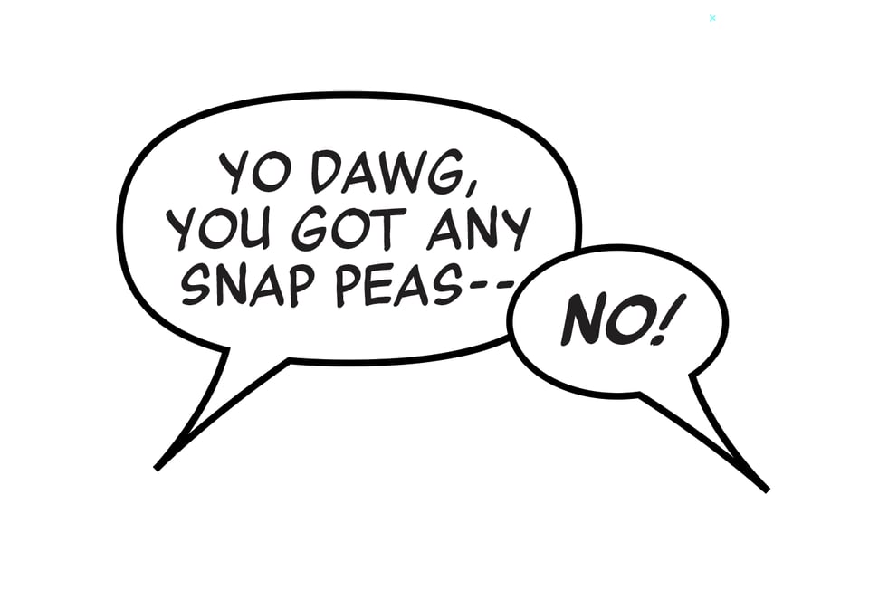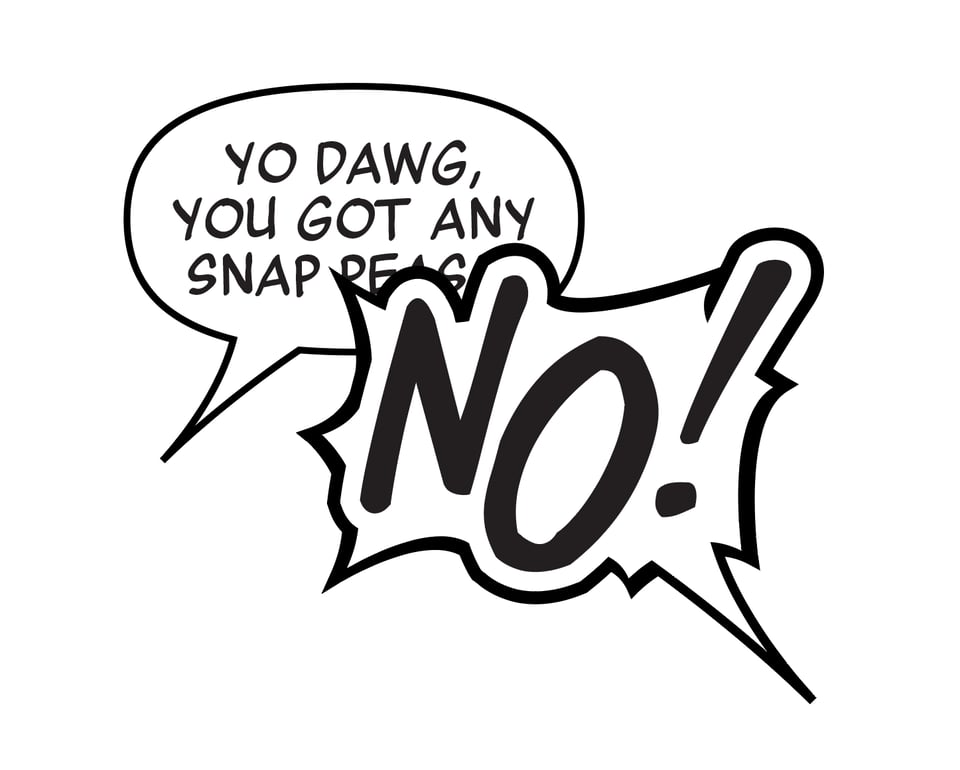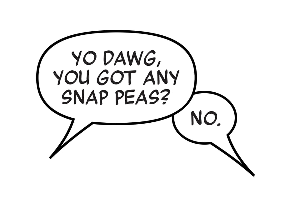 And this is a big, emotional interruption! This isn’t the first time they asked about snow peas today. Odds are they were asked about snow peas by the same person. I’m a stickler for readability, so I’ll only obscure the text in the first balloon only if the interruption itself is more important. Sometimes I’ll be asked to partially obscure normal text with more normal text from another speaker to someone talking over someone else, or to show that some speech is just atmospheric and less relevant to other speech. This will happen in scenes with crowd rabble or a focus character is being bombarded with speech.