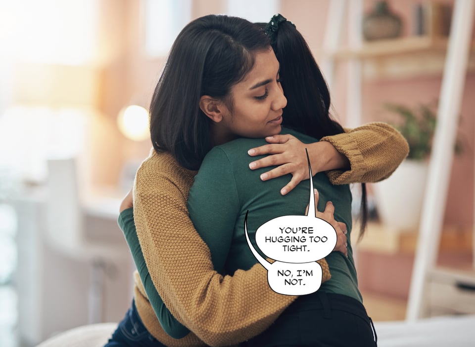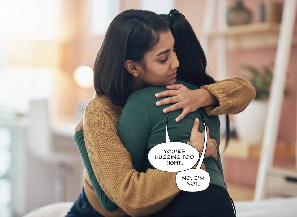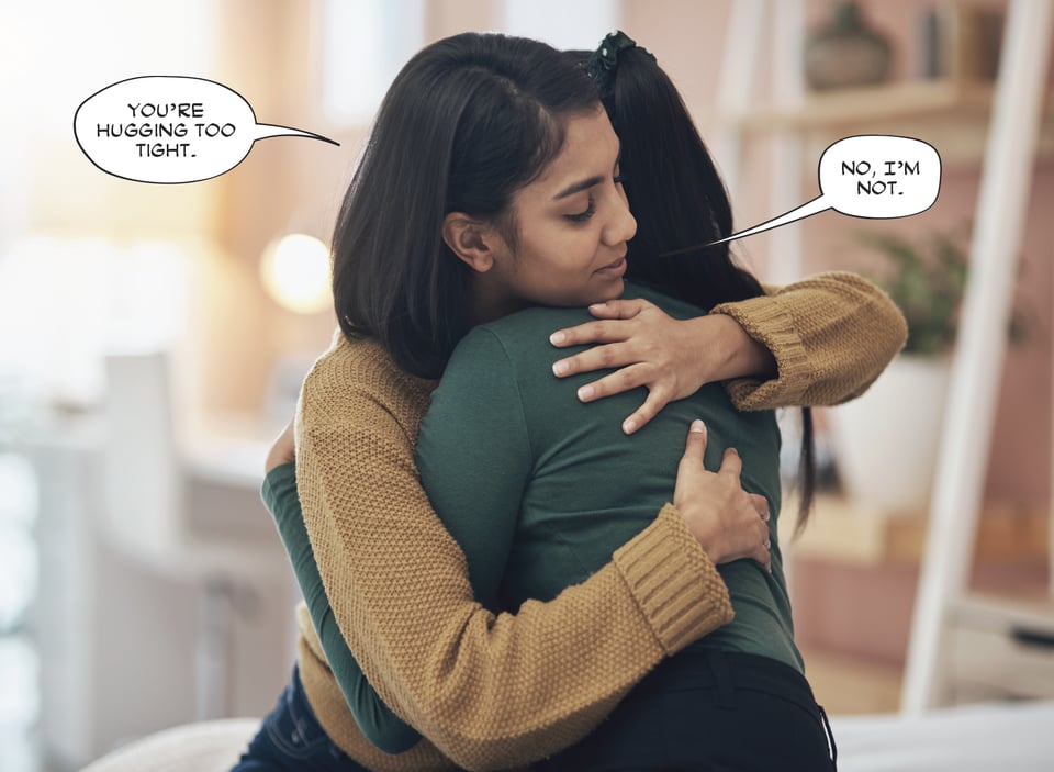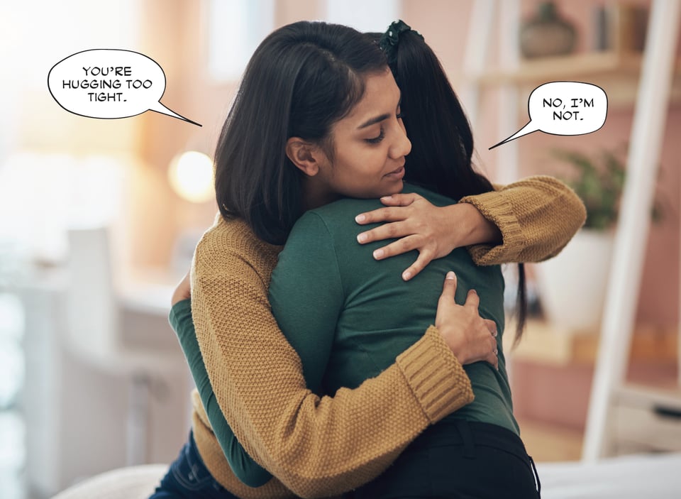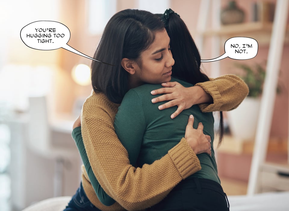This is slightly better. It’s certainly more clear which balloon belongs to which speaker, but here’s why this bugs me. If the hidden speaker’s mouth was visible, the tail that’s pointing to it would be very, very long—so long that if it weren’t obscured, it would be going all the way into her mouth. That makes me gag, both as a designer and reader. Also, if you really want to get nit-picky, you could also make the case that the first balloon is spoken by a third person who’s behind the two huggers. Like Jiminy Cricket, I guess. Or Jiminy Glick.