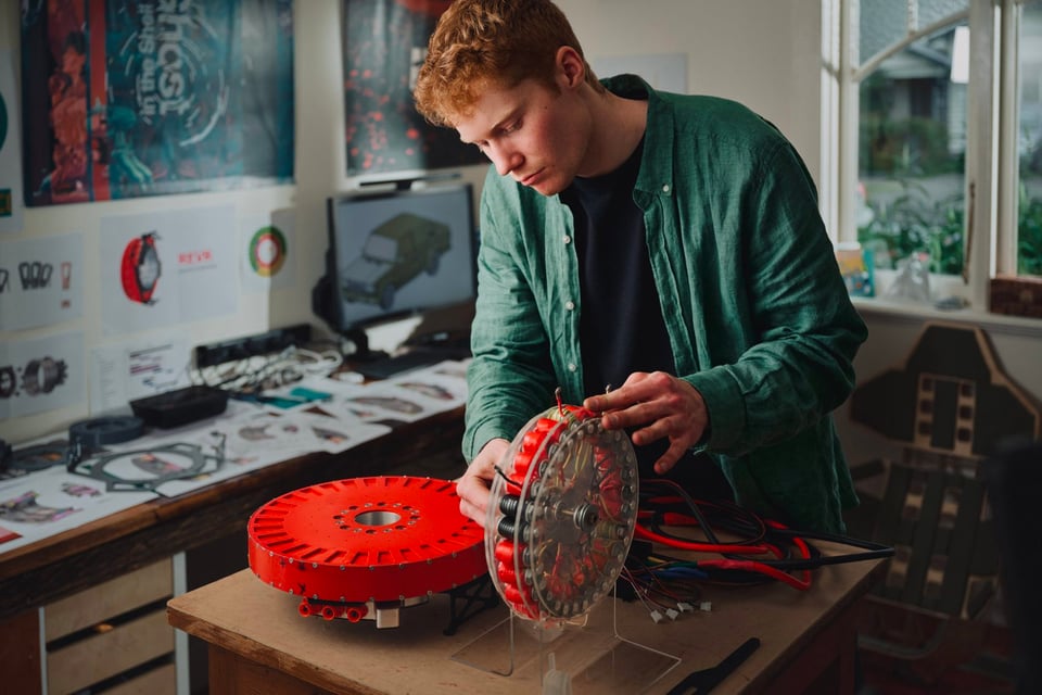 Basically, he's invented an axial flux motor that he mounts on between the disc brakes and the rear wheels. The batteries go in the wheel-well area; with some software to monitor the relationship with the gas engine, presto: It becomes a hybrid car. As he tells Dezeen ...