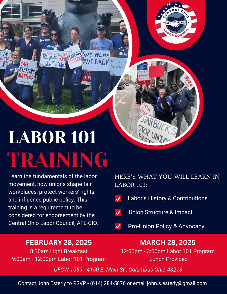 Central Ohio Labor Council Training โ Free Labor 101 Training in Reynoldsburg on Feb 28 (morning) and March 28 (afternoon) โ see attached flyer below for more info.