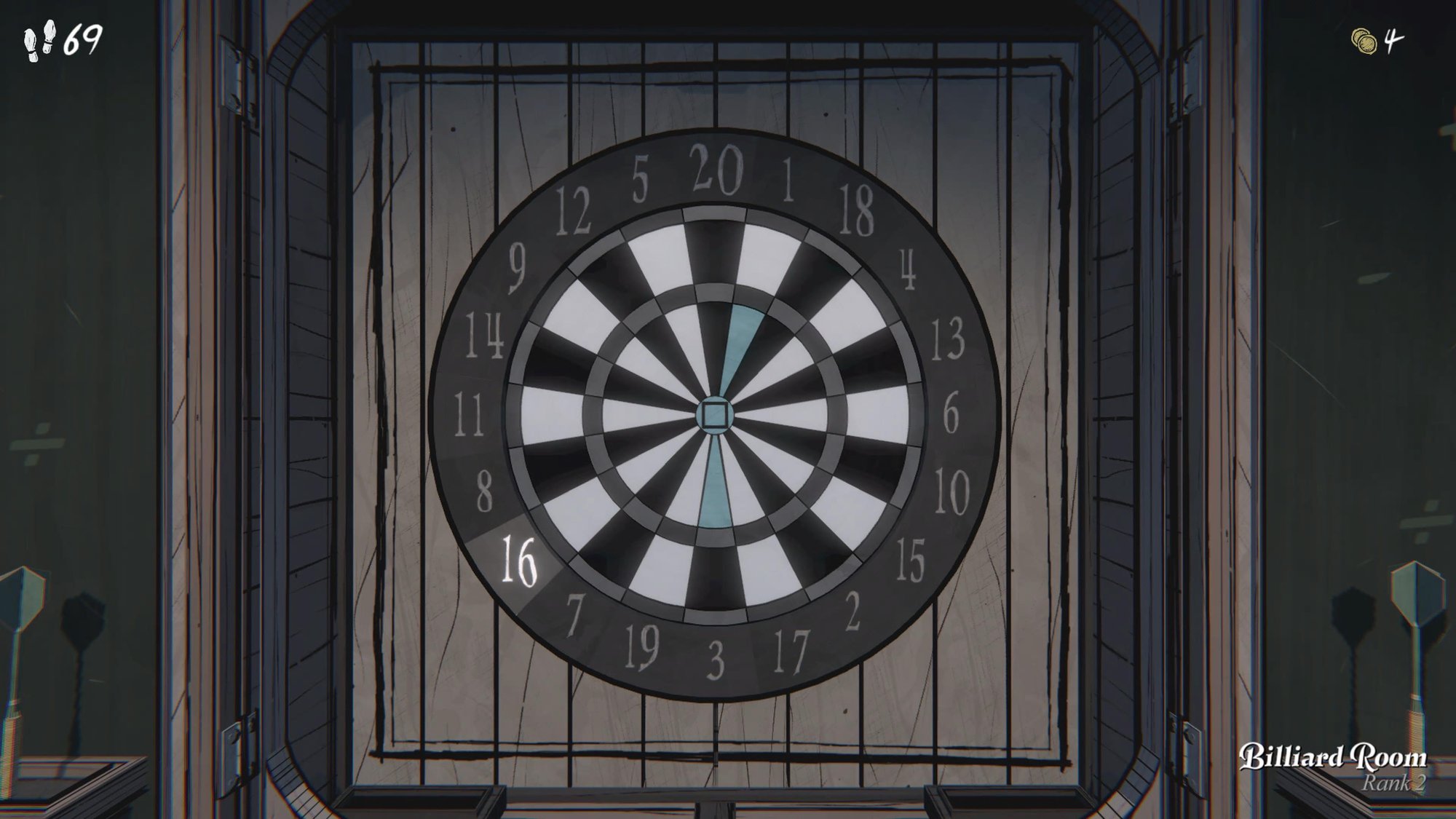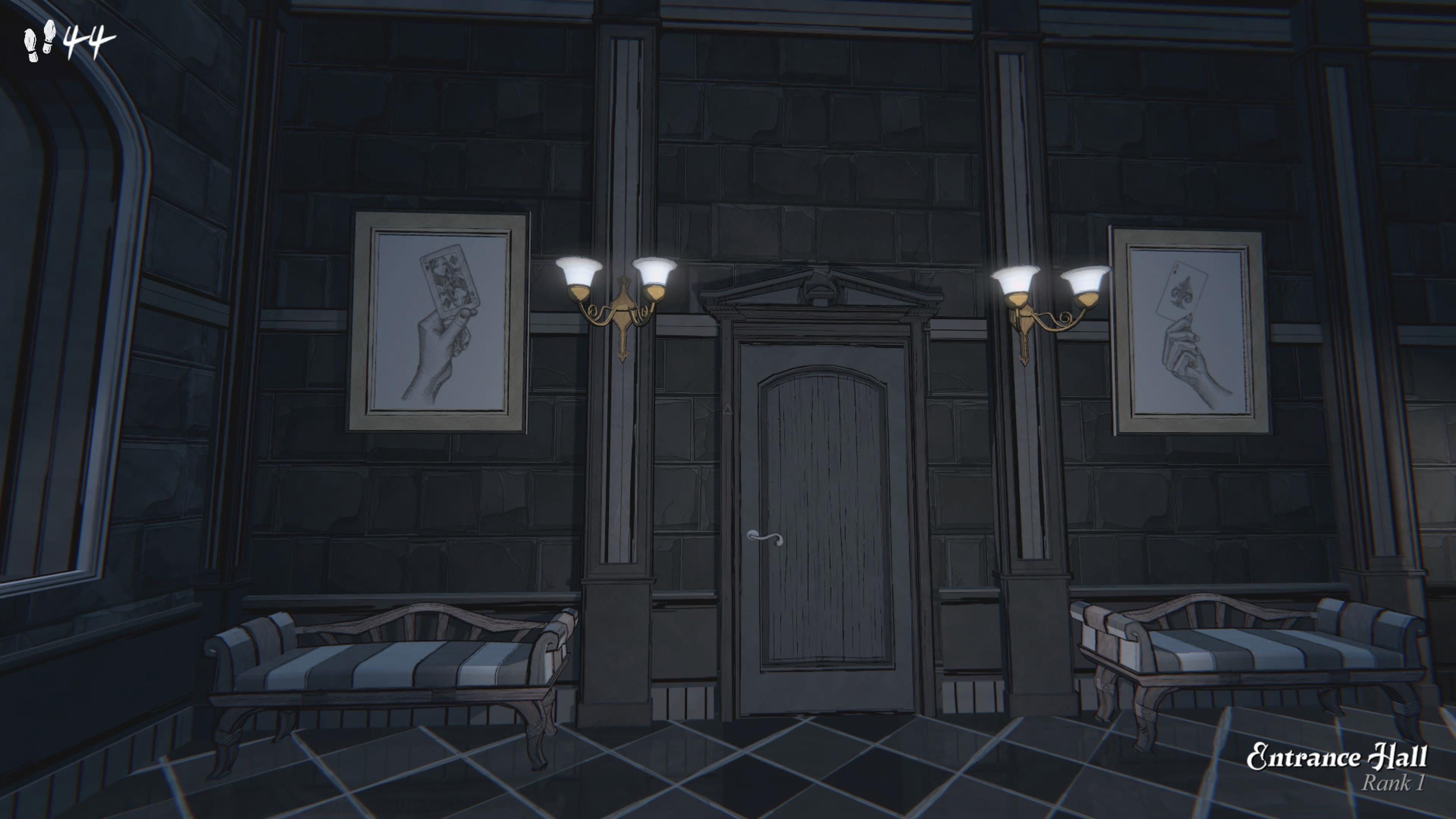 When you start the game, you start out on Day 1. You walk into the Entrance Hall (one of very few persistent game elements). In the top, left-hand corner, you see your step counter. This represents the number of steps you can take each day before you get exhausted and have to “call it quits,” as the game phrases it. When you open one of the three doors in the Entrance Hall, a menu pops up with three rooms, “chosen” randomly by the game, from which you draft one. I believe the first room I drafted was a Bedroom. When you enter your drafted room from the Entrance Hall, you lose at least one step (at the beginning of the game, you start with 50 steps). However, different rooms have different properties. Since my first room was a Bedroom, I lost a step upon entering but gained two steps, so I watched my step counter go from 50 to 49 to 51 in a couple seconds.